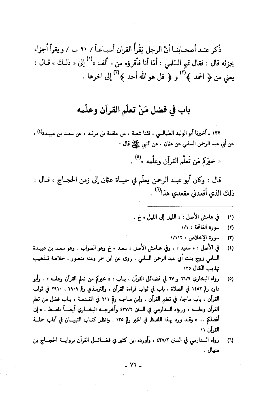 132 - أَخْبَرَنَا أَبُو الْوَلِيدِ الطَّيَالِسِيُّ، قَالَ: حَدَّثَنَا شُعْبَةُ، عَنْ عَلْقَمَةَ بْنِ مَرْثَدٍ، عَنْ سَعْدِ بْنِ عُبَيْدَةَ، عَنْ أَبِي عَبْدِ الرَّحْمَنِ السُّلَمِيِّ، عَنْ عُثْمَانَ، عَنِ النَّبِيِّ صَلَّى اللهُ عَلَيْهِ وَسَلَّمَ قَالَ: «§خَيْرُكُمْ مَنْ تَعَلَّمَ الْقُرْآنَ وَعَلَّمَهُ» قَالَ: وَكَانَ أَبُو عَبْدِ الرَّحْمَنِ يُعَلِّمُ فِي حَيَاةِ عُثْمَانَ إِلَى زَمَنِ الْحَجَّاجِ قَالَ: ذَلِكَ الَّذِي أَقْعَدَنِي مَقْعَدِي هَذَا. -[77]-