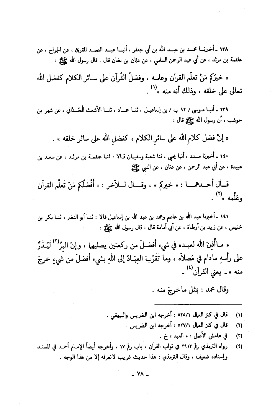 138 - أَخْبَرَنَا مُحَمَّدُ بْنُ عَبْدِ اللَّهِ بْنِ أَبِي جَعْفَرٍ، أَخْبَرَنَا عَبْدُ الْوَاحِدِ الْمُقْرِئُ، عَنِ الْجَرَّاحِ، عَنْ عَلْقَمَةَ بْنِ مَرْثَدٍ، عَنْ أَبِي عَبْدِ الرَّحْمَنِ السُّلَمِيِّ، عَنْ عُثْمَانَ بْنِ عَفَّانَ، قَالَ: قَالَ رَسُولُ اللَّهِ صَلَّى اللهُ عَلَيْهِ وَسَلَّمَ: «§خَيْرُكُمْ مَنْ تَعَلَّمَ الْقُرْآنَ وَعَلَّمَهُ، وَفَضْلُ الْقُرْآنِ عَلَى سَائِرِ الْكَلَامِ كَفَضْلِ اللَّهِ تَعَالَى عَلَى خَلْقِهِ وَذَلِكَ أَنَّهُ مِنْهُ»