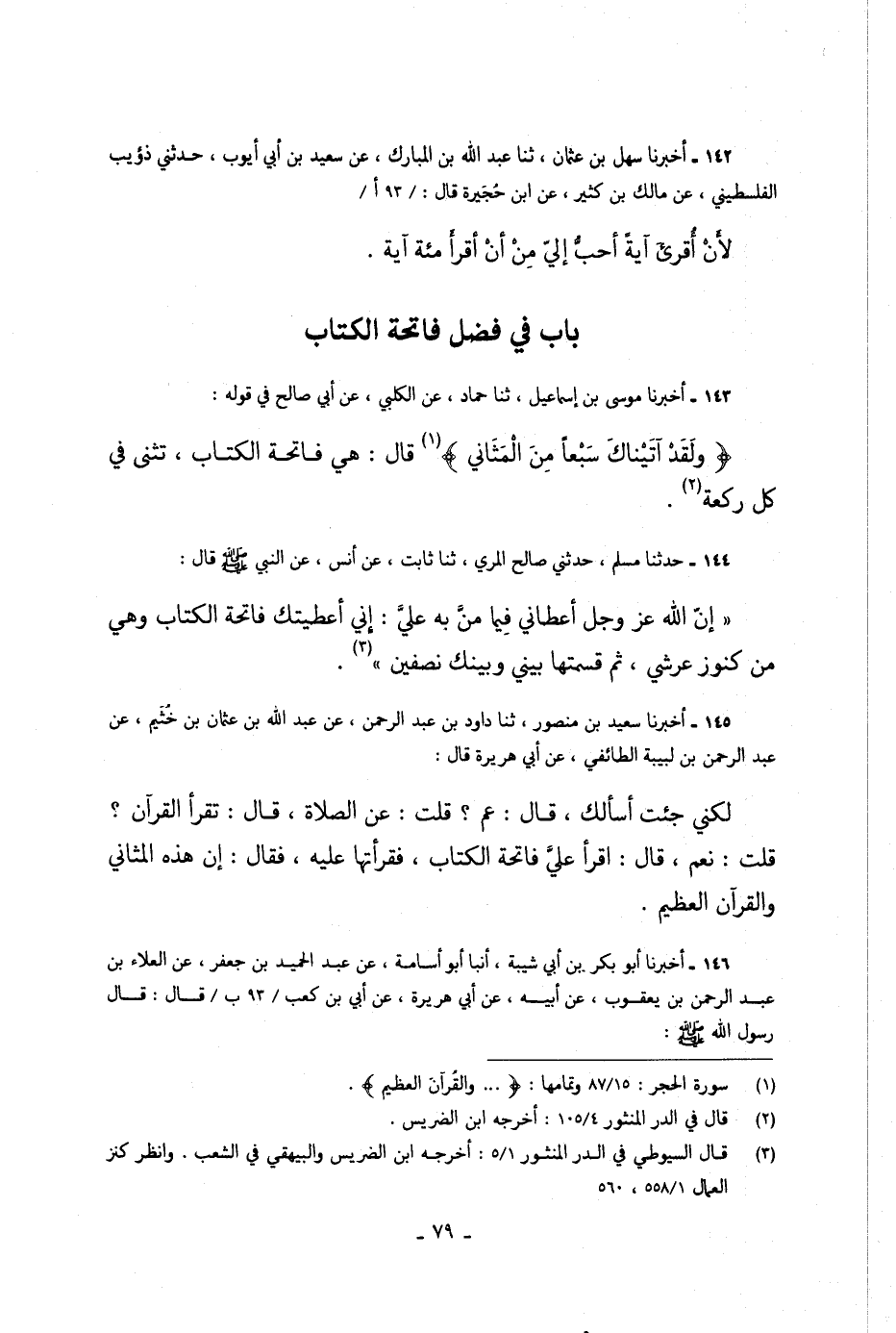 145 - أَخْبَرَنَا سَعِيدُ بْنُ مَنْصُورٍ، حَدَّثَنَا دَاوُدُ بْنُ عَبْدِ الرَّحْمَنِ، عَنْ عَبْدِ اللَّهِ بْنِ عُثْمَانَ بْنِ خُثَيْمٍ، عَنْ عَبْدِ الرَّحْمَنِ بْنِ لَبِيبَةَ الطَّائِفِيِّ، عَنْ أَبِي هُرَيْرَةَ، قَالَ: " §لَكِنِّي جِئْتُ أَسْأَلُكَ، قَالَ: عَمَّ؟ قُلْتُ: عَنِ الصَّلَاةِ. قَالَ: تَقْرَأُ الْقُرْآنَ؟ قُلْتُ: نَعَمْ. قَالَ: اقْرَأْ عَلَيَّ فَاتِحَةَ الْكِتَابِ. فَقَرَأْتُهَا عَلَيْهِ، فَقَالَ: إِنَّ هَذِهِ الْمَثَانِي وَالْقُرْآنُ الْعَظِيمُ "