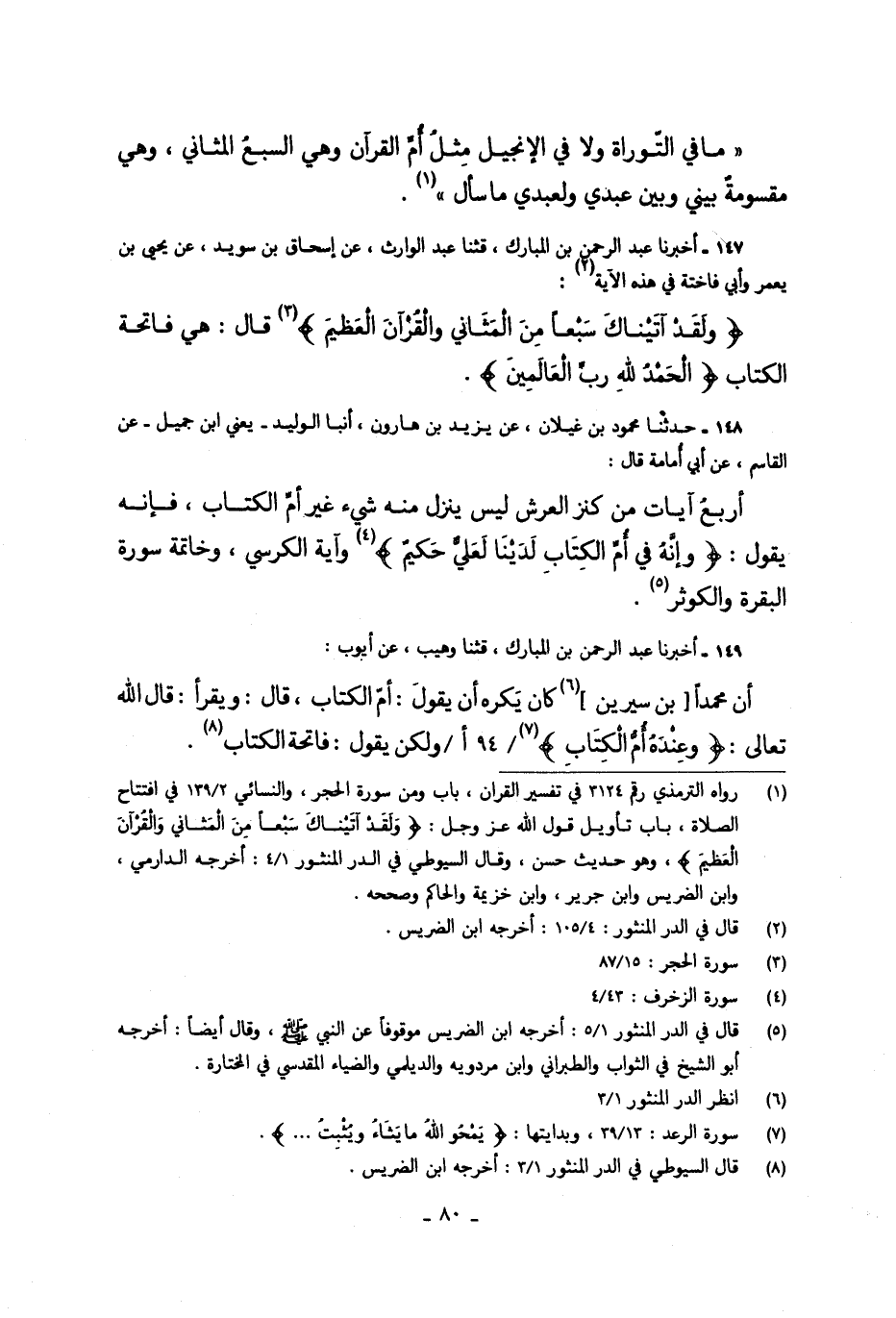 149 - أَخْبَرَنَا عَبْدُ الرَّحْمَنِ بْنُ الْمُبَارَكِ، قَالَ: حَدَّثَنَا وُهَيْبٌ، عَنْ أَيُّوبَ أَنَّ مُحَمَّدًا: " كَانَ يَكْرَهُ أَنْ يَقُولَ: أُمُّ الْكِتَابِ، قَالَ: وَيَقْرَأُ قَالَ تَعَالَى: {§وَعِنْدَهُ أُمُّ الْكِتَابِ} [الرعد: 39] وَلَكِنْ يَقُولُ: فَاتِحَةُ الْكِتَابِ "