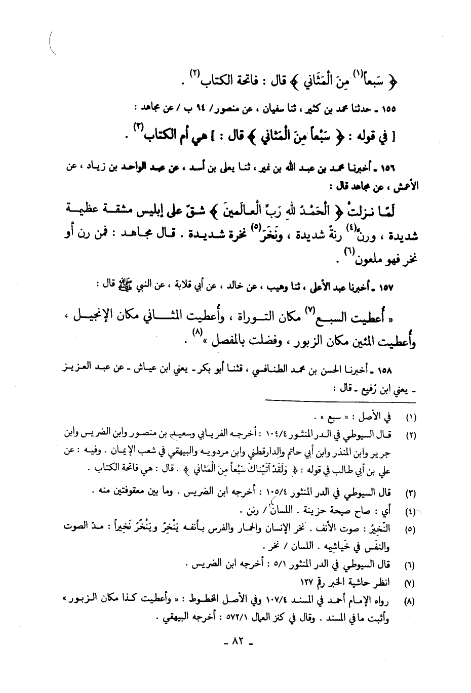 156 - أَخْبَرَنَا مُحَمَّدُ بْنُ عَبْدِ اللَّهِ بْنِ نُمَيْرٍ، قَالَ: حَدَّثَنَا مُعَلَّى بْنُ أَسَدٍ، عَنْ عَبْدِ الْوَاحِدِ بْنِ زِيَادٍ، عَنِ الْأَعْمَشِ، عَنْ مُجَاهِدٍ، قَالَ: " §لَمَّا نَزَلَتْ الْحَمْدُ لِلَّهِ رَبِّ الْعَالَمِينَ شَقَّ عَلَى إِبْلِيسَ مَشَقَّةً عَظِيمَةً شَدِيدَةً، وَرَنَّ رَنَّةً شَدِيدَةً، وَنَخَرَ نَخْرَةً شَدِيدَةً قَالَ مُجَاهِدٌ: «فَمَنْ رَنَّ أَوْ نَخَرَ فَهُوَ مَلْعُونٌ»