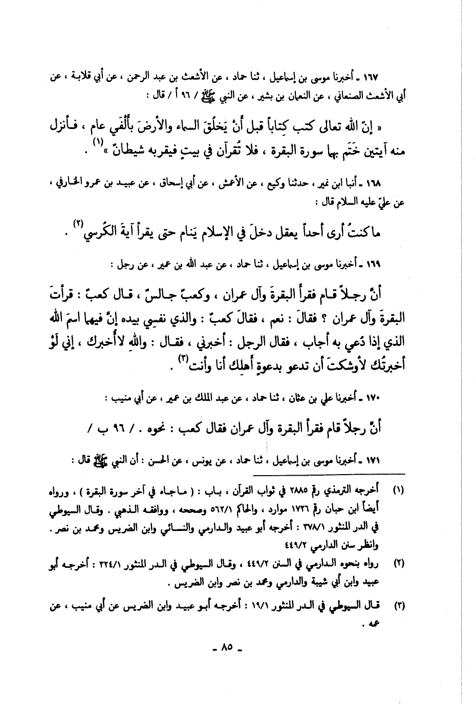167 - أَخْبَرَنَا مُوسَى بْنُ إِسْمَاعِيلَ، حَدَّثَنَا حَمَّادٌ، عَنِ الْأَشْعَثِ بْنِ عَبْدِ الرَّحْمَنِ، عَنْ أَبِي قِلَابَةَ، عَنْ أَبِي الْأَشْعَثِ الصَّنْعَانِيِّ، عَنِ النُّعْمَانِ بْنِ بَشِيرٍ، عَنِ النَّبِيِّ صَلَّى اللهُ عَلَيْهِ وَسَلَّمَ قَالَ: «إِنَّ اللَّهَ تَعَالَى §كَتَبَ كِتَابًا قَبْلَ أَنْ يَخْلُقَ السَّمَاءَ وَالْأَرْضَ بِأَلْفَيْ عَامٍ فَأَنْزَلَ مِنْهُ آيَتَيْنِ خَتَمَ بِهِمَا سُورَةَ الْبَقَرَةِ، فَلَا تُقْرَآنِ فِي بَيْتٍ فَيَقْرَبَهُ شَيْطَانٌ»