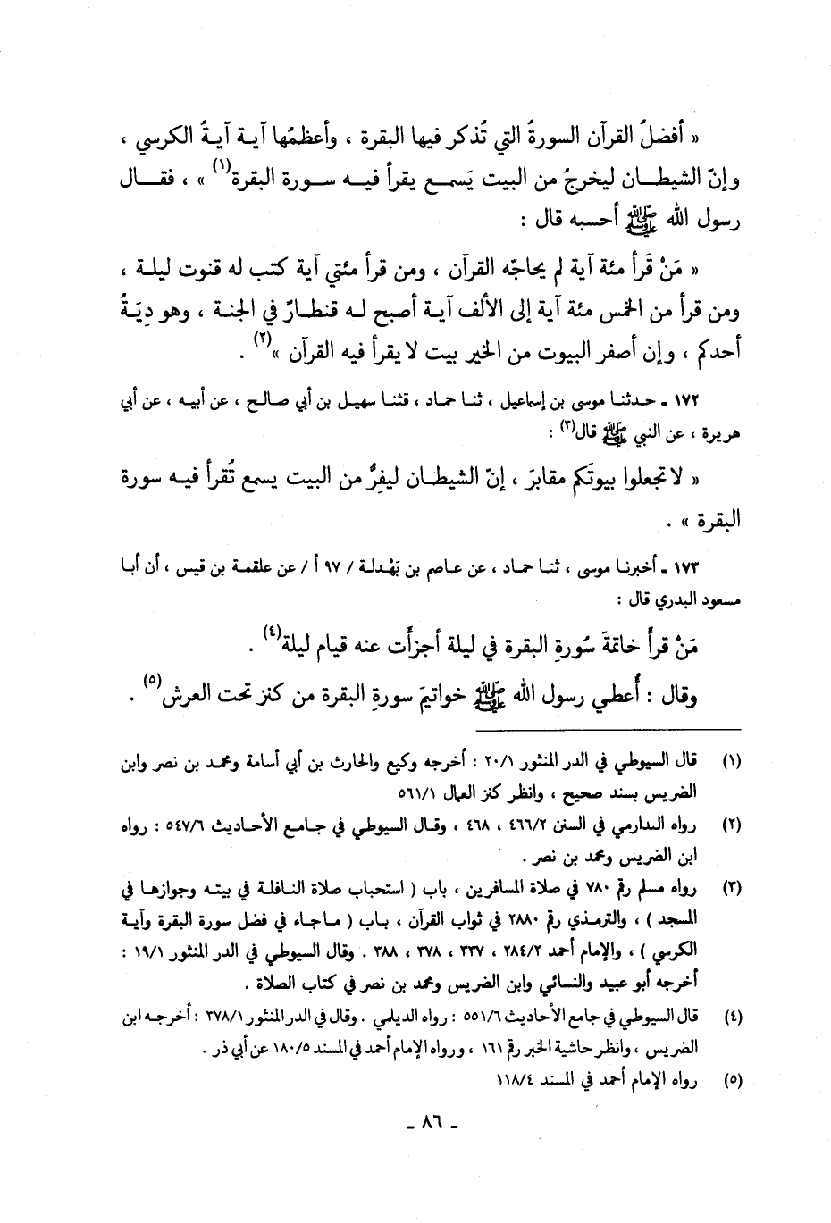 172 - حَدَّثَنَا مُوسَى بْنُ إِسْمَاعِيلَ، حَدَّثَنَا حَمَّادٌ، قَالَ: حَدَّثَنَا سُهَيْلُ بْنُ أَبِي صَالِحٍ، عَنْ أَبِيهِ، عَنْ أَبِي هُرَيْرَةَ، عَنِ النَّبِيِّ صَلَّى اللهُ عَلَيْهِ وَسَلَّمَ قَالَ: «§لَا تَجْعَلُوا بُيُوتَكُمْ مَقَابِرَ، إِنَّ الشَّيْطَانَ لَيَفِرُّ مِنَ الْبَيْتِ يَسْمَعُ يُقْرَأُ فِيهِ سُورَةُ الْبَقَرَةِ»