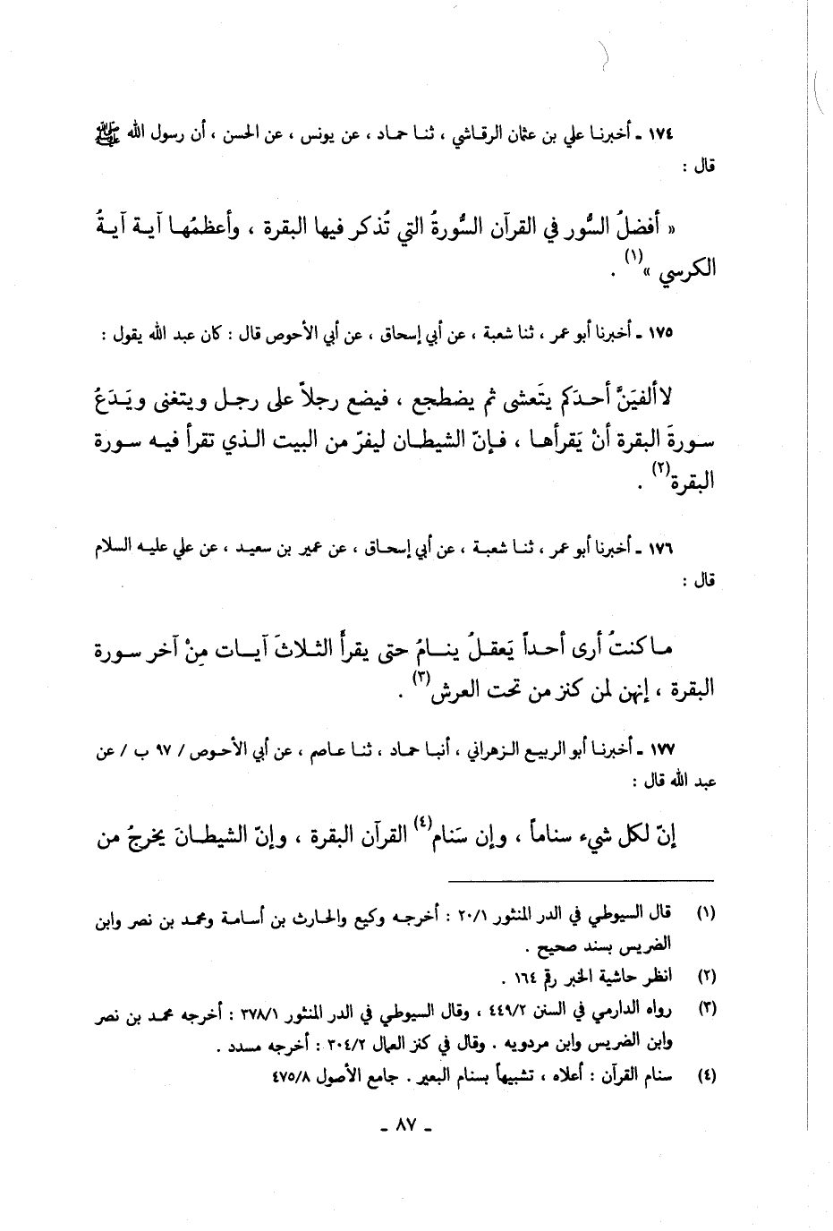 175 - أَخْبَرَنَا أَبُو عُمَرَ، أَخْبَرَنَا شُعْبَةُ، عَنْ أَبِي إِسْحَاقَ، عَنْ أَبِي الْأَحْوَصِ، قَالَ: كَانَ عَبْدُ اللَّهِ يَقُولُ: «§لَا أَلْفِيَنَّ أَحَدَكُمْ يَتَعَشَّى، ثُمَّ يَضْطَجِعُ فَيَضَعُ رِجْلًا عَلَى رِجْلٍ، وَيَتَغَنَّى، وَيَدَعُ سُورَةَ الْبَقَرَةِ أَنْ يَقْرَأْهَا، فَإِنَّ الشَّيْطَانَ لَيَفِرُّ مِنَ الْبَيْتِ الَّذِي تُقْرَأُ فِيهِ سُورَةُ الْبَقَرَةِ»
