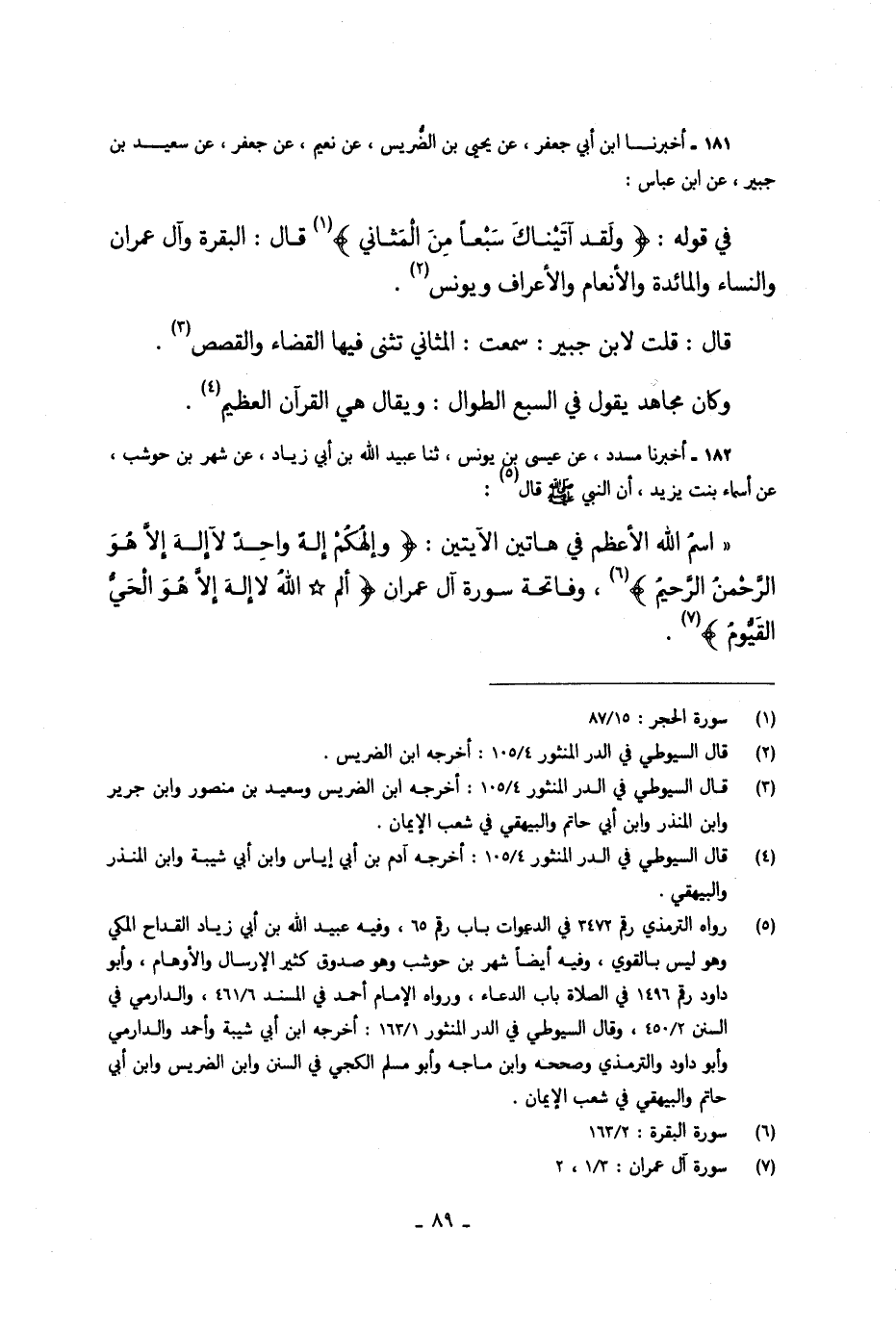 181 - أَخْبَرَنَا ابْنُ أَبِي جَعْفَرٍ، عَنْ يَحْيَى بْنِ الضُّرَيْسِ، عَنْ نُعَيْمٍ، عَنْ جَعْفَرٍ، عَنْ سَعِيدِ بْنِ جُبَيْرٍ، عَنِ ابْنِ عَبَّاسٍ: " فِي قَوْلِهِ: {§وَلَقَدْ آتَيْنَاكَ سَبْعًا مِنَ الْمَثَانِي} [الحجر: 87] قَالَ: الْبَقَرَةُ، وَآلُ عِمْرَانَ، وَالنِّسَاءُ، وَالْمَائِدَةُ، وَالْأَنْعَامُ، وَالْأَعْرَافُ، وَيُونُسُ قَالَ: قُلْتُ لِابْنِ جُبَيْرٍ: سَمِعْتُ الْمَثَانِيَ يُثْنَى فِيهَا الْقَضَاءُ، وَالْقَصَصُ، وَكَانَ مُجَاهِدٌ يَقُولُ فِي السَّبْعِ الطِّوَالِ: وَيُقَالُ: هِيَ الْقُرْآنُ الْعَظِيمُ