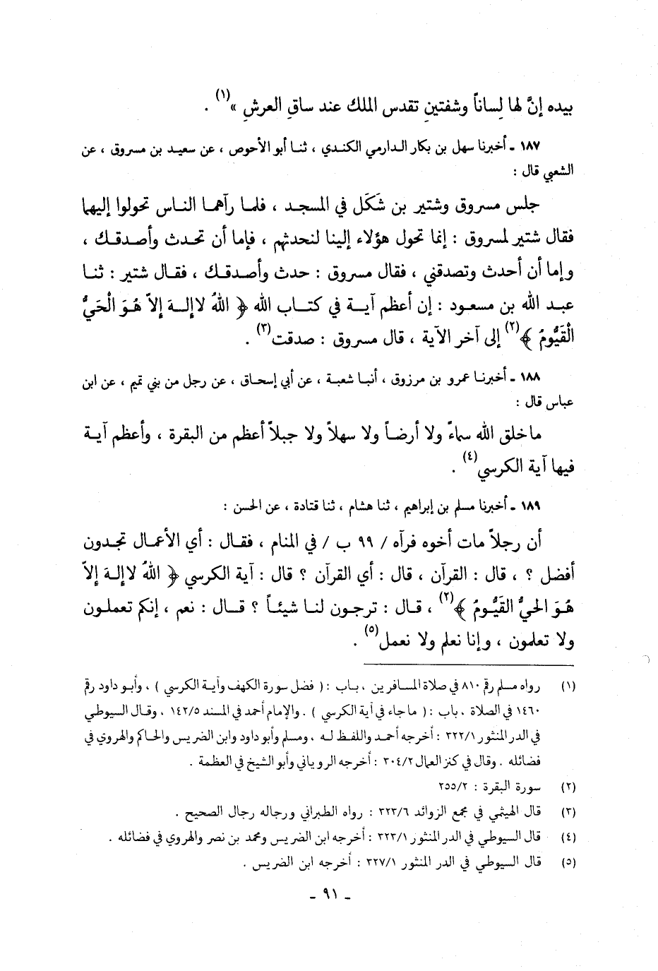 187 - أَخْبَرَنَا سَهْلُ بْنُ بَكَّارٍ الدَّارِمِيُّ الْكِنْدِيُّ، حَدَّثَنَا أَبُو الْأَحْوَصِ، عَنْ سَعِيدِ بْنِ مَسْرُوقٍ، عَنِ الشَّعْبِيِّ، قَالَ: " جَلَسَ مَسْرُوقٌ، وَشُتَيْرُ بْنُ شَكَلٍ فِي الْمَسْجِدِ، فِيمَا رَآهُمَا النَّاسُ، تَحَوَّلُوا إِلَيْهِمَا فَقَالَ شُتَيْرٌ لِمَسْرُوقٍ: إِنَّمَا تَحَوَّلَ هَؤُلَاءِ إِلَيْنَا لِنُحَدِّثَهُمْ، فَإِمَّا أَنْ تُحَدِّثَ وَأُصَدِّقَكَ، وَإِمَّا أَحْدَثَ وَتُصَدِّقَنِي. فَقَالَ مَسْرُوقٌ: قُمْ حَدِّثْ وَأُصَدِّقُكَ فَقَالَ شُتَيْرٌ: حَدَّثَنَا عَبْدُ اللَّهِ بْنُ مَسْعُودٍ: " §إِنَّ أَعْظَمَ آيَةٍ فِي كِتَابِ اللَّهِ: {اللَّهُ لَا إِلَهَ إِلَّا هُوَ الْحَيُّ الْقَيُّومُ} [البقرة: 255] إِلَى آخِرِ الْآيَةِ فَقَالَ مَسْرُوقٌ: صَدَقْتَ "