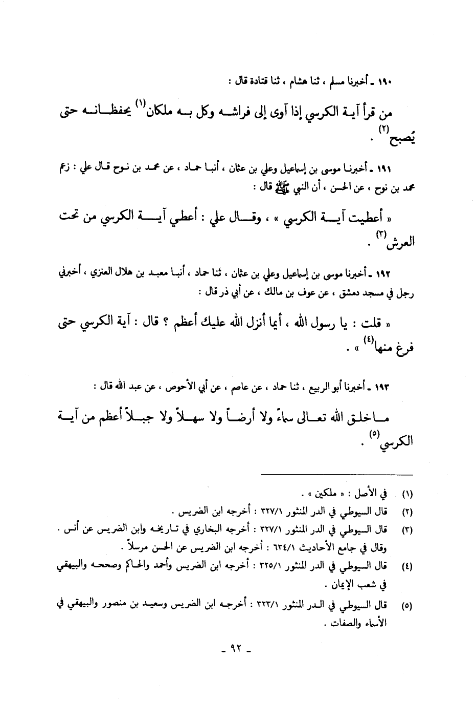 190 - أَخْبَرَنَا مُسْلِمٌ، قَالَ: حَدَّثَنَا هِشَامٌ، حَدَّثَنَا قَتَادَةُ، قَالَ: «§مَنْ قَرَأَ آيَةَ الْكُرْسِيِّ إِذَا آوَى إِلَى فِرَاشِهِ، وُكِلَ بِهِ مَلَكَيْنِ يَحْفَظَانِهِ حَتَّى يُصْبِحَ»