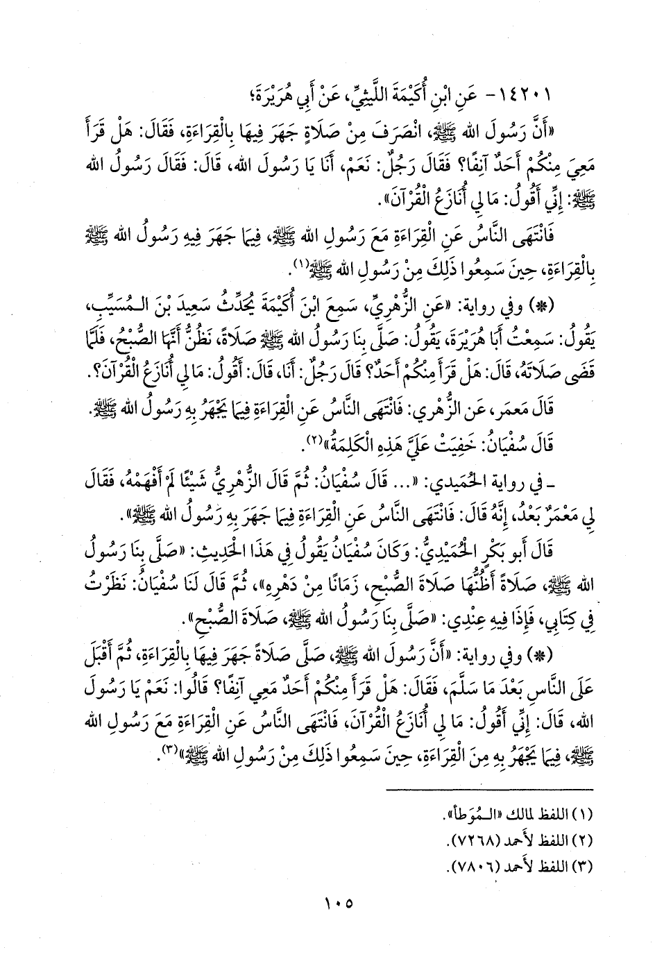- وفي رواية: «عن الزُّهْري، سمع ابن أكيمة يحدث سعيد بن المُسَيب، يقول: سمعت أبا هريرة، يقول: صلى بنا رسول الله صَلى الله عَليه وسَلم صلاة، نظن أنها الصبح، فلما قضى صلاته، قال: هل قرأ منكم أحد؟ قال رجل: أنا، قال: أقول: ما لي أنازع القرآن؟.