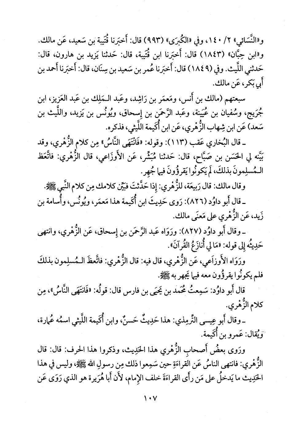 - قال البخاري عقب (١١٣): وقوله: «فانتهى الناس» من كلام الزُّهْري، وقد بينه لي الحسن بن صباح، قال: حدثنا مبشر، عن الأوزاعي، قال الزُّهْري: فاتعظ المسلمون بذلك، لم يكونوا يقرؤون فيما جهر.