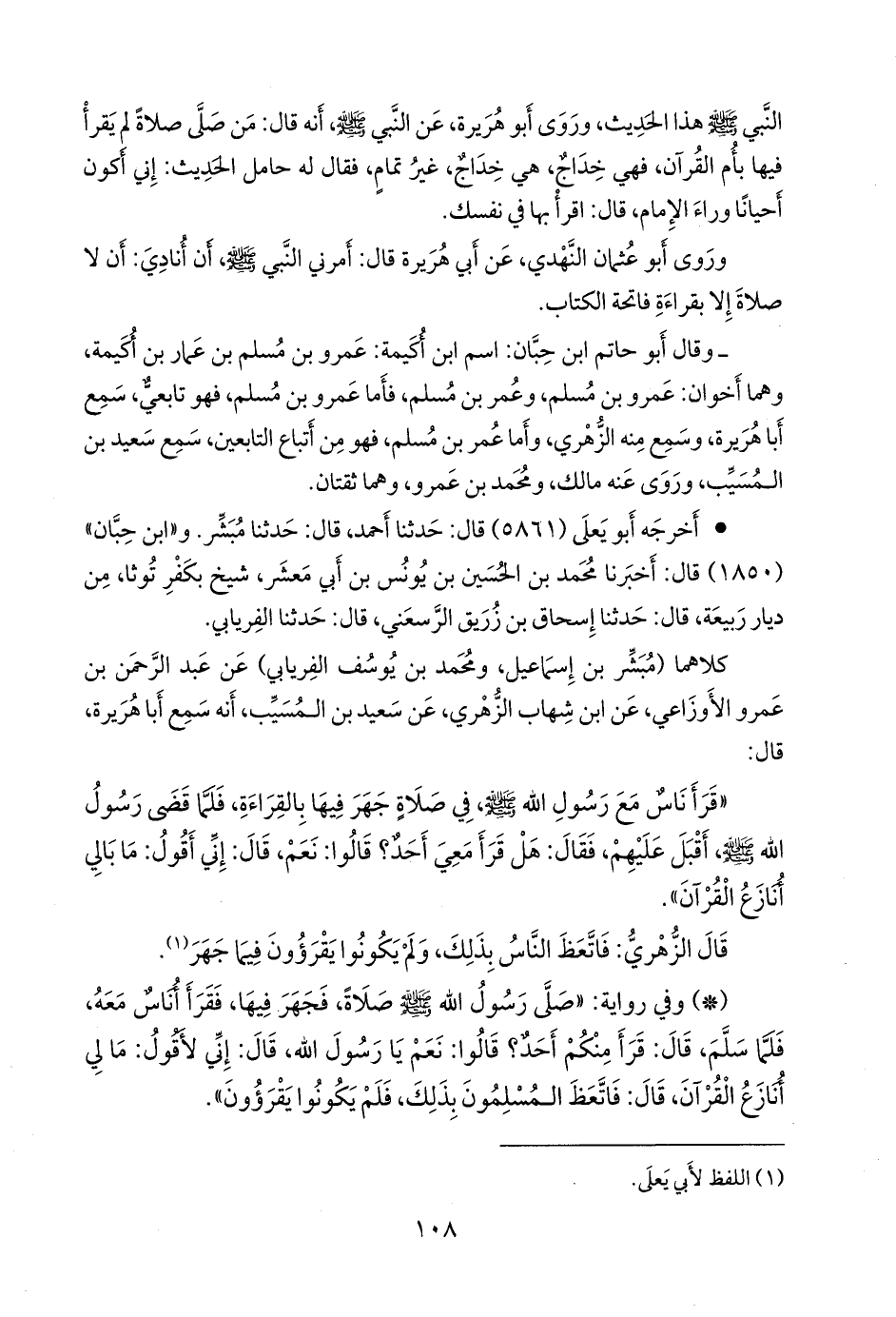 «قرأ ناس مع رسول الله صَلى الله عَليه وسَلم في صلاة جهر فيها بالقراءة، فلما قضى رسول الله صَلى الله عَليه وسَلم أقبل عليهم، فقال: هل قرأ معي أحد؟ قالوا: نعم، قال: إني أقول: ما بالي أنازع القرآن».