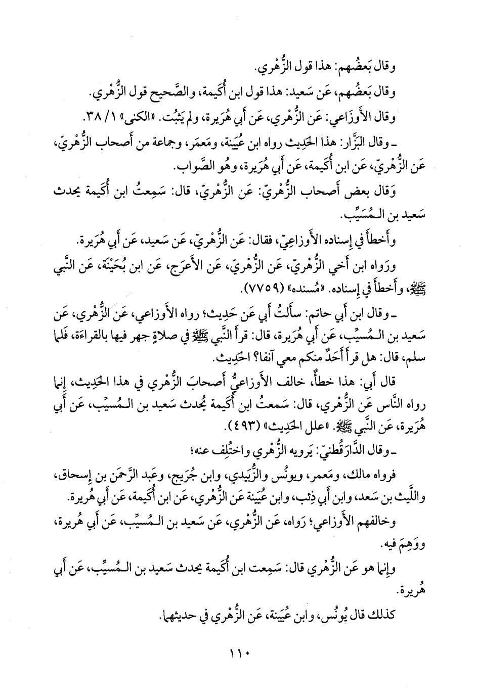 قال أبي: هذا خطأ خالف الأوزاعي أصحاب الزُّهْري في هذا الحديث، إنما رواه الناس عن الزُّهْري، قال: سمعت ابن أكيمة يحدث سعيد بن المُسَيب، عن أبي هريرة، عن النبي صَلى الله عَليه وسَلم. «علل الحديث» (٤٩٣).
