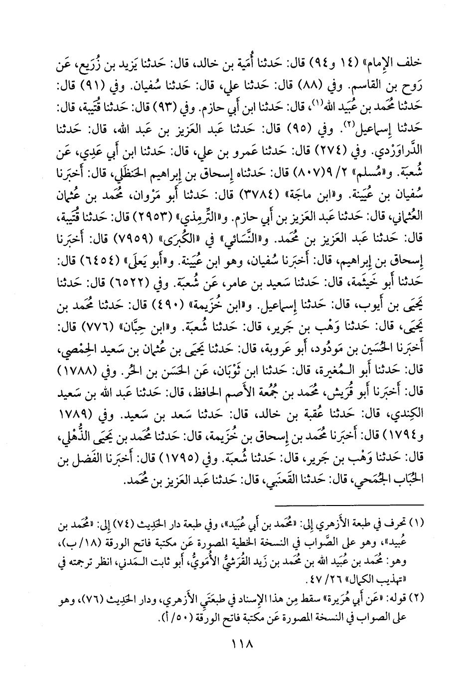 وفي (٨٨) قال: حدثنا علي، قال: حدثنا سفيان. وفي (٩١) قال: حدثنا محمد بن عُبيد الله (¬١)، قال: حدثنا ابن أبي حازم. وفي (٩٣) قال: حدثنا قتيبة، قال: حدثنا إسماعيل (¬٢). وفي (٩٥) قال: حدثنا عبد العزيز بن عبد الله، قال: حدثنا الدراوَرْدي. وفي (٢٧٤) قال: حدثنا عَمرو بن علي، قال: حدثنا ابن أَبي عَدي، عن شعبة. و «مسلم» ٢/ ٩ (٨٠٧) قال: حدثناه إسحاق بن إبراهيم الحنظلي، قال: أخبرنا سفيان بن عُيينة. و «ابن ماجة» (٣٧٨٤) قال: حدثنا أَبو مروان، محمد بن عثمان العثماني، قال: حدثنا عبد العزيز بن أبي حازم. و «التِّرمِذي» (٢٩٥٣) قال: حدثنا قتيبة، قال: حدثنا عبد العزيز بن محمد. و «النَّسَائي» في «الكبرى» (٧٩٥٩) قال: أخبرنا إسحاق بن إبراهيم، قال: أخبرنا سفيان، وهو ابن عُيينة. و «أَبو يَعلى» (٦٤٥٤) قال: حدثنا أَبو خيثمة، قال: حدثنا سعيد بن عامر، عن شعبة. وفي (٦٥٢٢) قال: حدثنا يحيى بن أيوب، قال: حدثنا إسماعيل. و «ابن خزيمة» (٤٩٠) قال: حدثنا محمد بن يحيى، قال: حدثنا وهب بن جرير، قال: حدثنا شعبة. و «ابن حِبَّان» (٧٧٦) قال: أخبرنا الحسين بن مودود، أَبو عَروبَة، قال: حدثنا يحيى بن عثمان بن سعيد الحِمصي، قال: حدثنا أَبو المغيرة، قال: حدثنا ابن ثوبان، عن الحسن بن الحر. وفي (١٧٨٨) قال: أخبرنا أَبو قريش، محمد بن جمعة الأصم الحافظ، قال: حدثنا عبد الله بن سعيد الكندي، قال: حدثنا عقبة بن خالد، قال: حدثنا سعد بن سعيد. وفي (١٧٨٩ و ١٧٩٤) قال: أخبرنا محمد بن إسحاق بن خزيمة، قال: حدثنا محمد بن يحيى الذُّهْلي، قال: حدثنا وهب بن جرير، قال: حدثنا شعبة. وفي (١٧٩٥) قال: أخبرنا الفضل بن الحُبَاب الجُمحي، قال: حدثنا القَعنَبي، قال: حدثنا عبد العزيز بن محمد.