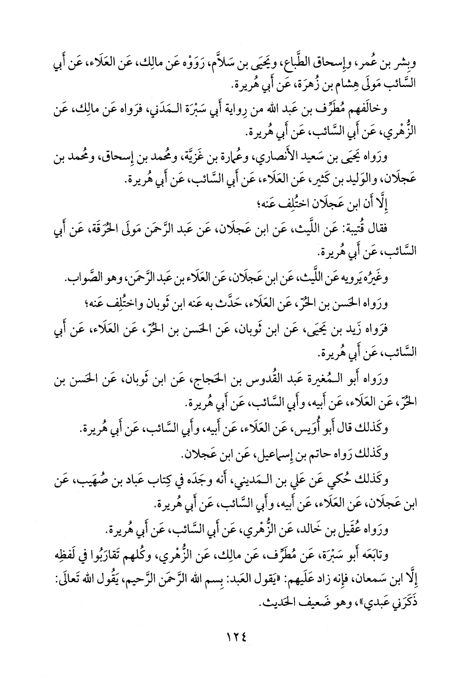 - وقال الدارقُطني: روى هذا الحديث جماعة من الثقات، عن العلاء بن عبد الرَّحمَن، منهم: مالك بن أنس، وابن جُريج، وروح بن القاسم، وابن عُيينة، وابن عَجلان، والحسن بن الحر، وأَبو أويس وغيرهم، على اختلاف منهم في الإسناد، واتفاق منهم على المتن. «السنن» (١١٨٩).