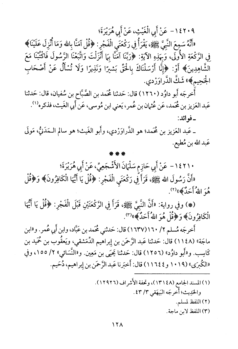 «أنه سمع النبي صَلى الله عَليه وسَلم يقرأ في ركعتي الفجر: {قل آمنا بالله وما أنزل علينا} في الركعة الأولى، وبهذه الآية: {ربنا آمنا بما أنزلت واتبعنا الرسول فاكتبنا مع الشاهدين} أو: {إنا أرسلناك بالحق بشيرا ونذيرا ولا تسأل عن أصحاب الجحيم}» شك الدراوَرْدي.
