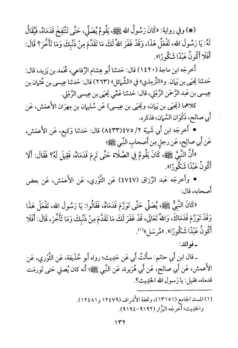 - قال عبد الرَّحمَن بن أبي حاتم الرازي: سألتُ أبي عن حديثٍ؛ رواه أَبو حذيفة، عن الثوري، عن الأعمش، عن أبي صالح، عن أبي هريرة، عن النبي صَلى الله عَليه وسَلم؛ أنه كان يصلي حتى تورمت قدماه، فقيل: يا رسول الله الحديث؟.