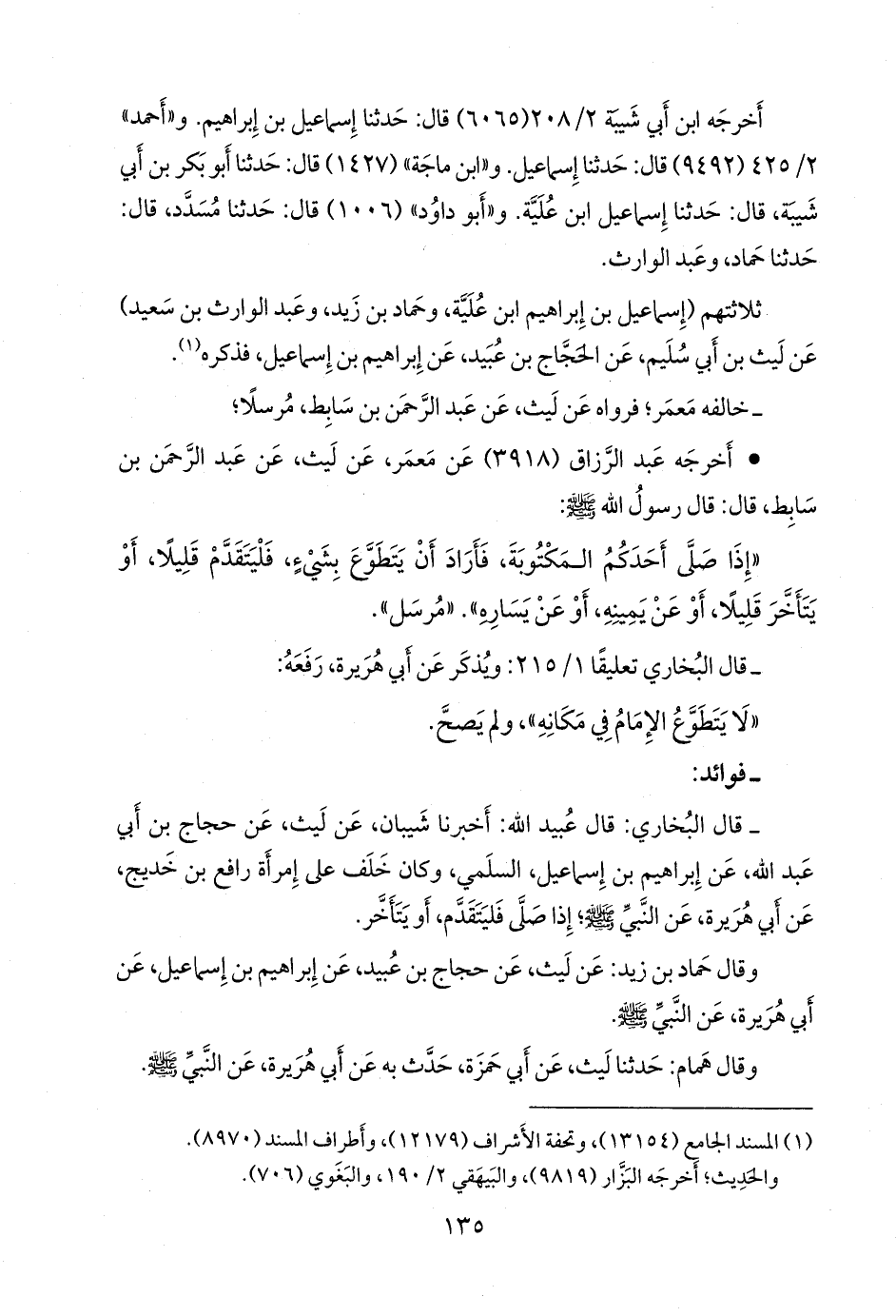 - وقال البخاري: قال عُبيد الله: أخبرنا شَيبان، عن ليث، عن حجاج بن أبي عبد الله، عن إبراهيم بن إسماعيل، السلمي، وكان خلف على امرأة رافع بن خَدِيج، عن أبي هريرة، عن النبي صَلى الله عَليه وسَلم؛ إذا صلى فليتقدم، أو يتأخر.