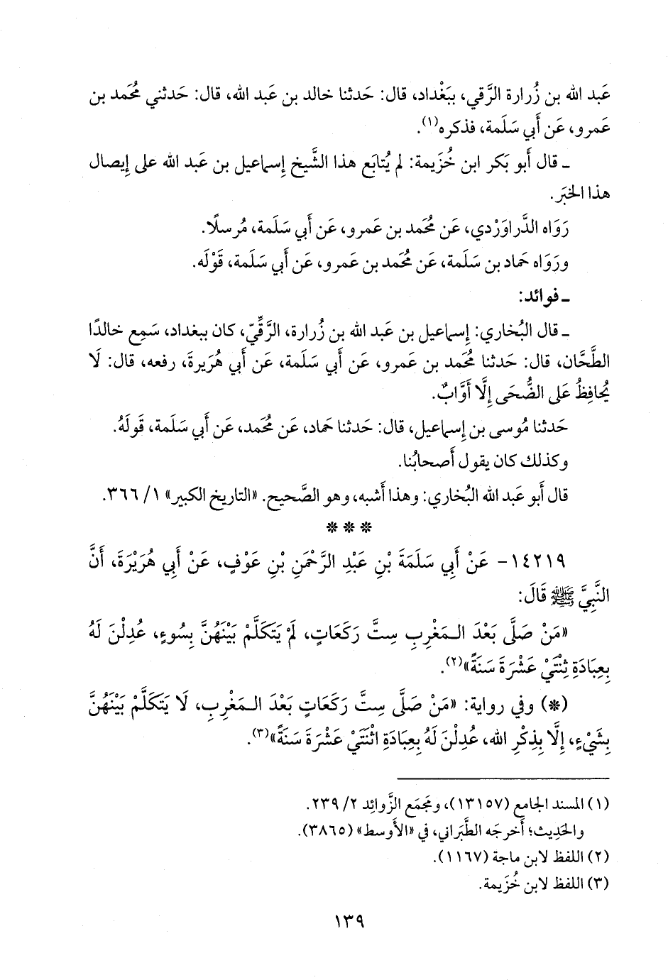 - قال البخاري: إسماعيل بن عبد الله بن زُرارة، الرَّقِّي، كان ببغداد، سمع خالدا الطحان، قال: حدثنا محمد بن عَمرو، عن أبي سلمة، عن أبي هريرة، رفعه، قال: لا يحافظ على الضحى إلا أواب.