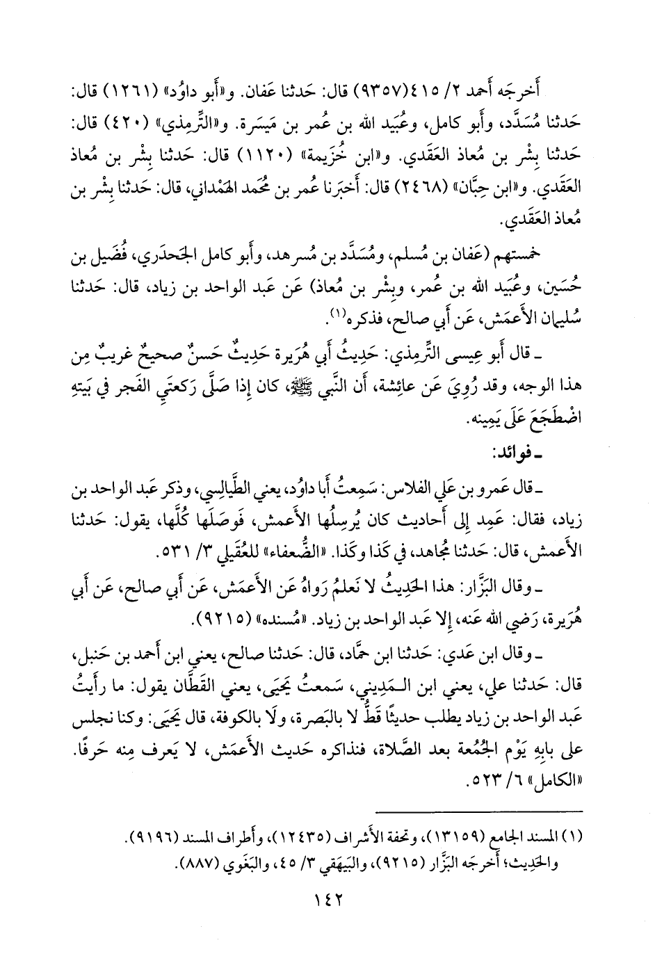 خمستهم (عفان بن مسلم، ومُسَدَّد بن مسرهد، وأَبو كامل الجَحدري، فضيل بن حسين، وعُبيد الله بن عمر، وبشر بن معاذ) عن عبد الواحد بن زياد، قال: حدثنا سليمان الأعمش، عن أبي صالح، فذكره (¬١).