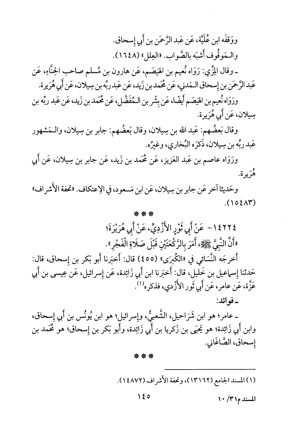- عامر؛ هو ابن شراحيل، الشعبي، وإسرائيل؛ هو ابن يونس بن أبي إسحاق، وابن أبي زائدة؛ هو يحيى بن زكريا بن أبي زائدة، وأَبو بكر بن إسحاق؛ هو محمد بن إسحاق، الصاغاني.