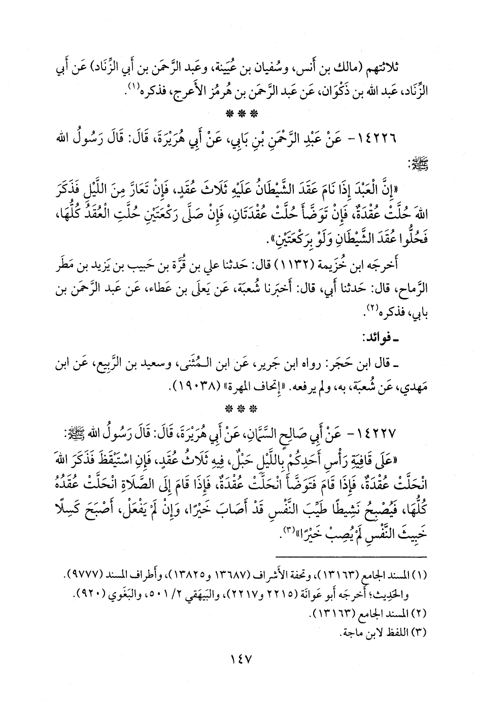 «إن العبد إذا نام عقد الشيطان عليه ثلاث عقد، فإن تعار من الليل فذكر الله حلت عقدة، فإن توضأ حلت عقدتان، فإن صلى ركعتين حلت العقد كلها، فحلوا عقد الشيطان ولو بركعتين».