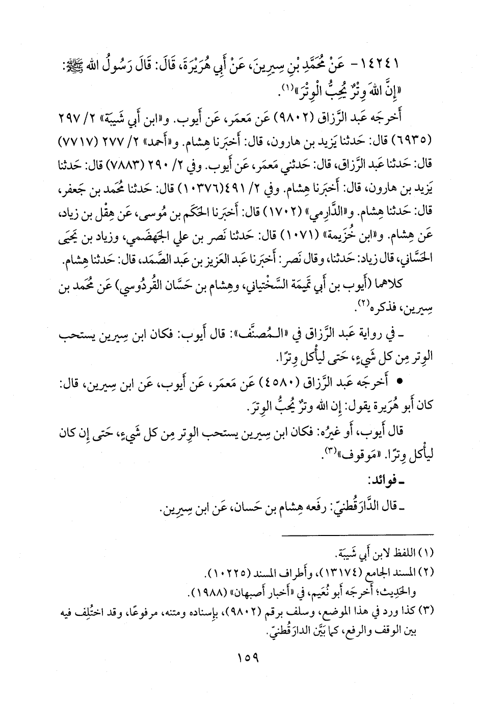 - في رواية عبد الرزاق في «المُصَنَّف»: قال أيوب: فكان ابن سِيرين يستحب الوتر من كل شيء، حتى لياكل وترا.