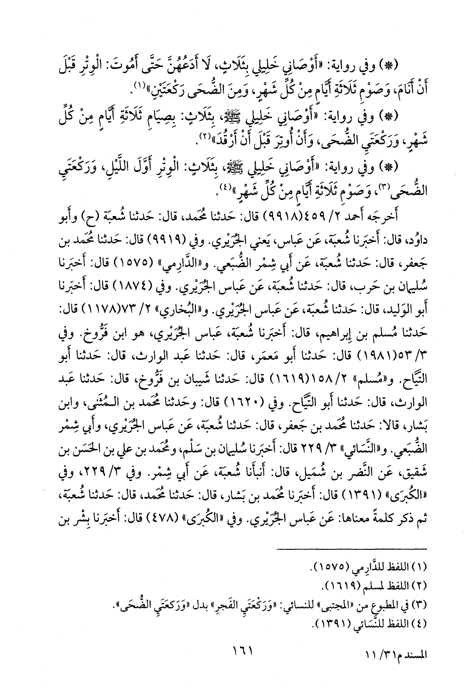وفي ٣/ ٤١ (١٩٨١) قال: حدثنا أَبو مَعمَر، قال: حدثنا عبد الوارث، قال: حدثنا أَبو التياح. و «مسلم» ٢/ ١٥٨ (١٦١٩) قال: حدثنا شَيبان بن فَرُّوخ، قال: حدثنا عبد الوارث، قال: حدثنا أَبو التياح. وفي (١٦٢٠) قال: وحدثنا محمد بن المثنى، وابن بشار، قالا: حدثنا محمد بن جعفر، قال: حدثنا شعبة، عن عباس الجُريري، وأبي شمر الضبعي. و «النَّسَائي» ٣/ ٢٢٩ قال: أخبرنا سليمان بن سلم، ومحمد بن علي بن الحسن بن شقيق، عن النضر بن شميل، قال: أنبأنا شعبة، عن أبي شمر. وفي ٣/ ٢٢٩، وفي «الكبرى» (١٣٩١) قال: أخبرنا محمد بن بشار، قال: حدثنا محمد، قال: حدثنا شعبة، ثم ذكر كلمة معناها: عن عباس الجُريري. وفي «الكبرى» (٤٧٨) قال: أخبرنا بشر بن