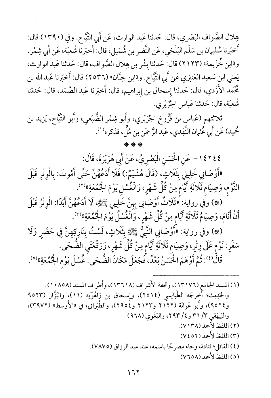 «أوصاني خليلي بثلاث، (قال هُشيم:) فلا أدعهن حتى أموت: بالوتر قبل النوم، وصيام ثلاثة أيام من كل شهر، والغسل يوم الجمعة» (¬١).