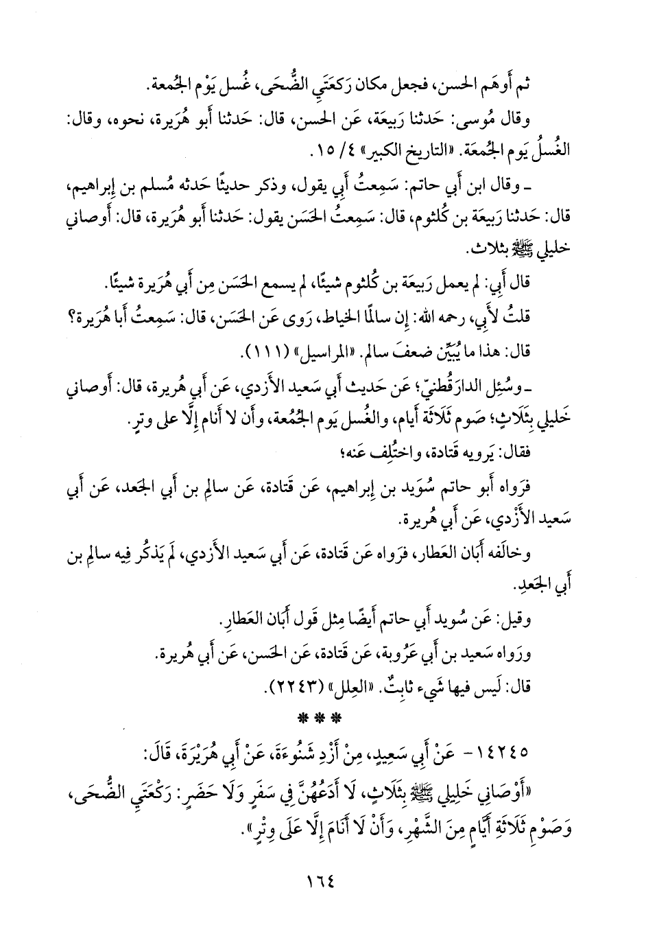 «أوصاني خليلي صَلى الله عَليه وسَلم بثلاث، لا أدعهن في سفر ولا حضر: ركعتي الضحى، وصوم ثلاثة أيام من الشهر، وأن لا أنام إلا على وتر».