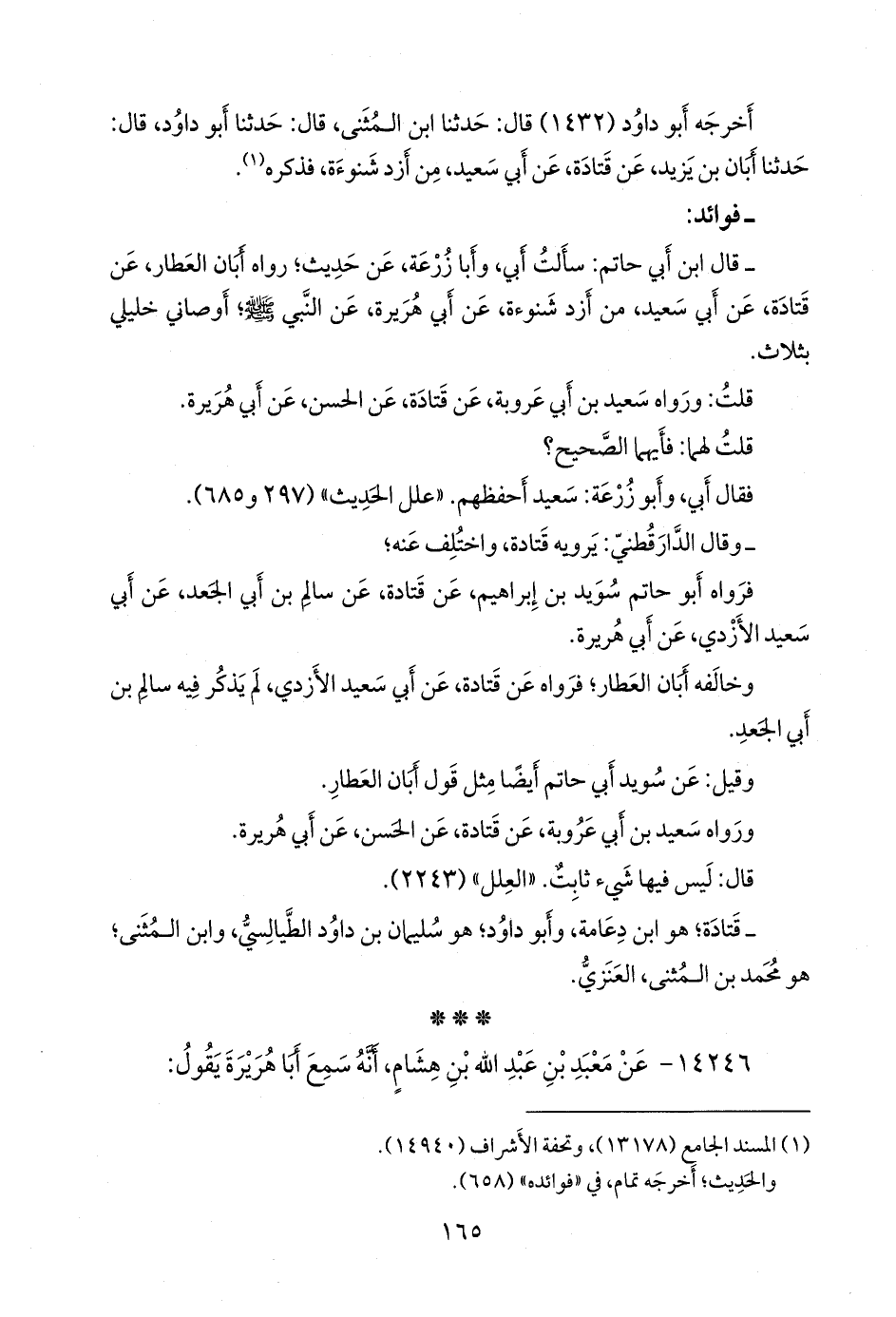 - قال عبد الرَّحمَن بن أبي حاتم الرازي: سألت أبي، وأَبا زُرعَة، عن حديث؛ رواه أبان العطار، عن قتادة، عن أبي سعيد، من أزد شنوءة، عن أبي هريرة، عن النبي صَلى الله عَليه وسَلم؛ أوصاني خليلي بثلاث.