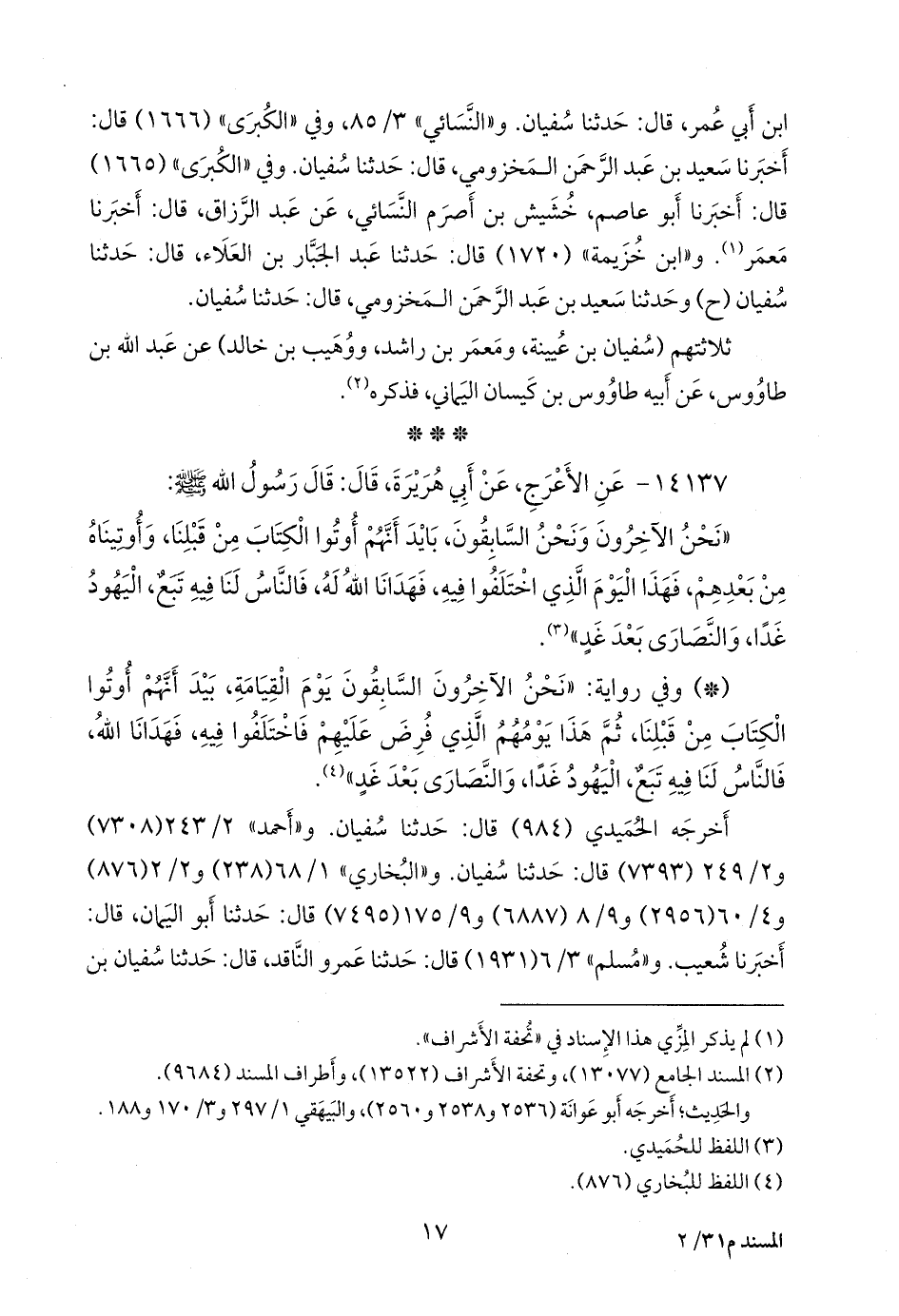 ثلاثتهم (سفيان بن عُيينة، وشعيب بن أبي حمزة، ومالك بن أنس) عن أبي الزناد عبد الله بن ذكوان، عن عبد الرَّحمَن بن هُرمُز الأعرج، فذكره (¬١).