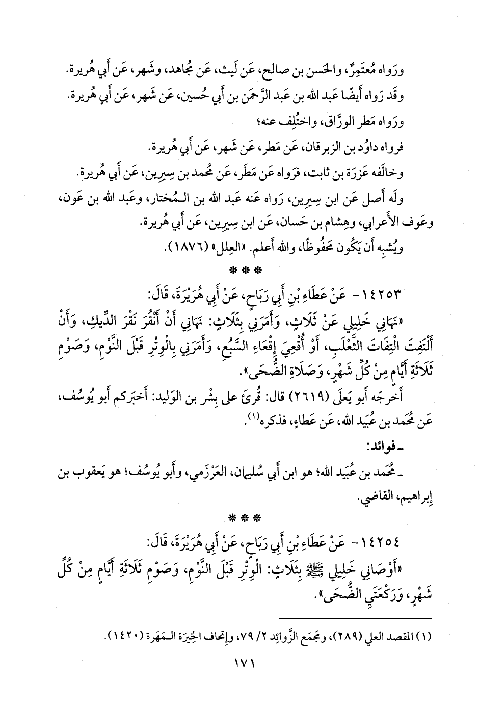 «نهاني خليلي عن ثلاث، وأمرني بثلاث: نهاني أن أنقر نقر الديك، وأن ألتفت التفات الثعلب، أو أقعي إقعاء السبع، وأمرني بالوتر قبل النوم، وصوم ثلاثة أيام من كل شهر، وصلاة الضحى».
