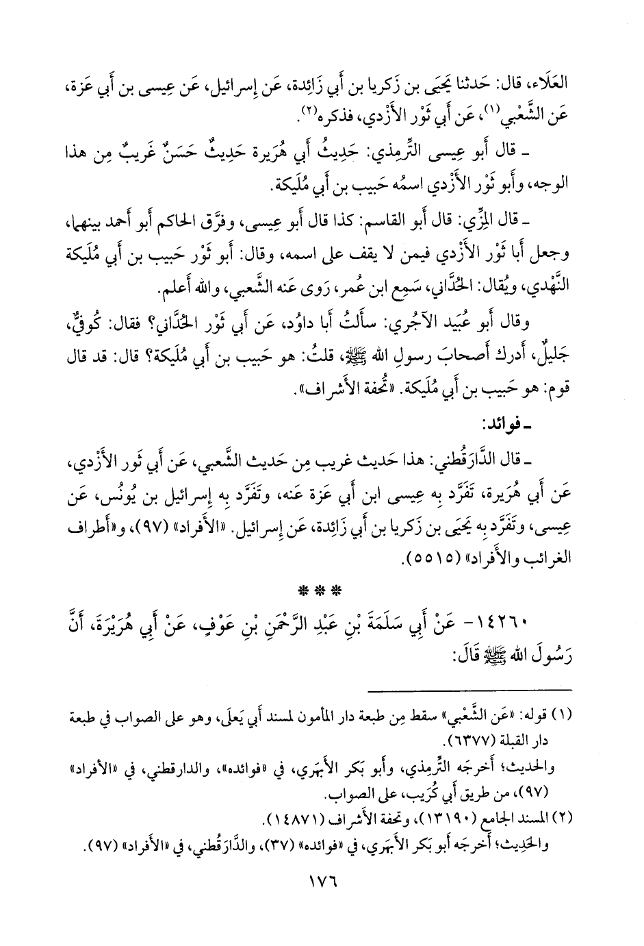 - قال الدارقُطني: هذا حديثٌ غريبٌ من حديث الشعبي، عن أبي ثور الأزدي، عن أبي هريرة، تفرد به عيسى بن أبي عزة عنه، وتفرد به إسرائيل بن يونس، عن عيسى، وتفرد به يحيى بن زكريا بن أبي زائدة، عن إسرائيل. «الأفراد» (٩٧)، و «أطراف الغرائب والأفراد» (٥٥١٥).