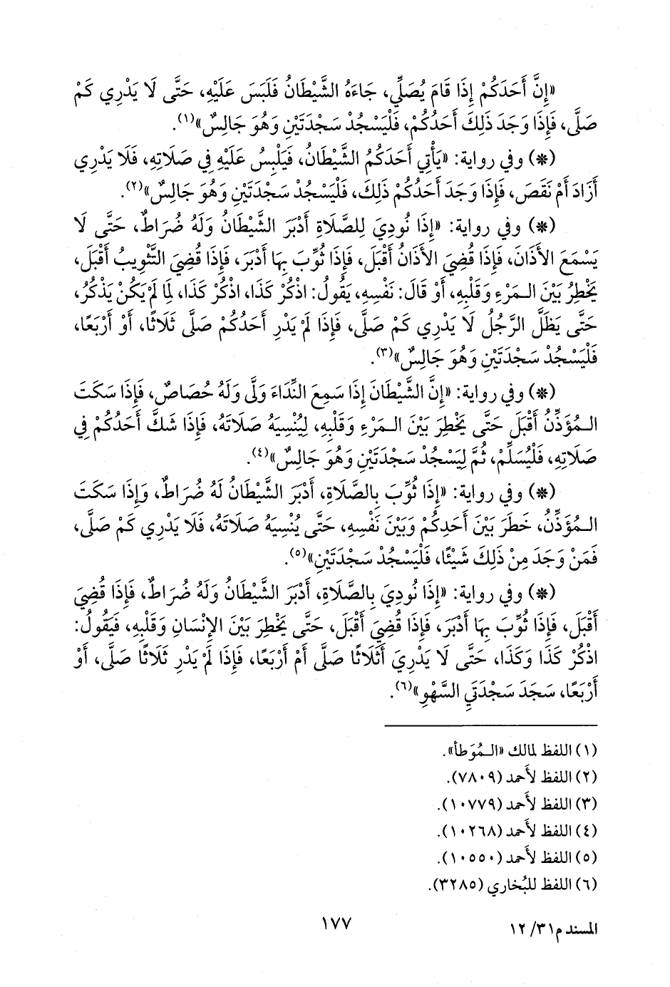 - وفي رواية: «إن الشيطان يدخل بين بني آدم وبين نفسه, فلا يدري كم صلى, فإذا وجد ذلك, فليسجد سجدتين قبل أن يسلم» (¬٤).