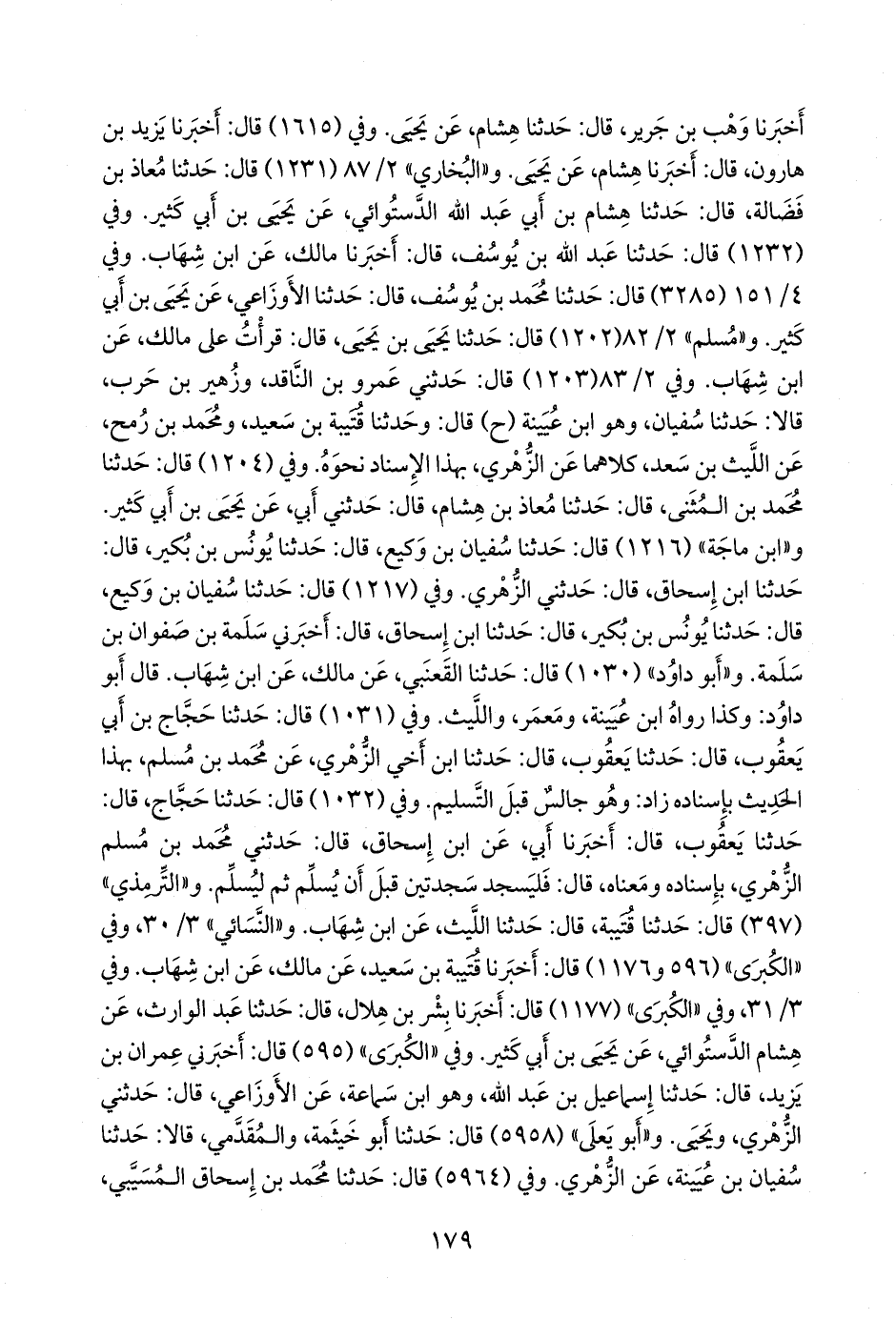و «مسلم» ٢/ ٨٢ (١٢٠٢) قال: حدثنا يحيى بن يحيى، قال: قرأتُ على مالك، عن ابن شهاب. وفي ٢/ ٨٣ (١٢٠٣) قال: حدثني عَمرو بن الناقد، وزهير بن حرب، قالا: حدثنا سفيان، وهو ابن عُيينة (ح) قال: وحدثنا قتيبة بن سعيد، ومحمد بن رُمح، عن الليث بن سعد، كلاهما عن الزُّهْري، بهذا الإسناد نحوه. وفي (١٢٠٤) قال: حدثنا محمد بن المثنى، قال: حدثنا معاذ بن هشام، قال: حدثني أبي، عن يحيى بن أبي كثير. و «ابن ماجة» (١٢١٦) قال: حدثنا سفيان بن وكيع، قال: حدثنا يونس بن بكير، قال: حدثنا ابن إسحاق، قال: حدثني الزُّهْري. وفي (١٢١٧) قال: حدثنا سفيان بن وكيع، قال: حدثنا يونس بن بكير، قال: حدثنا ابن إسحاق، قال: أخبرني سلمة بن صفوان بن سلمة. و «أَبو داود» (١٠٣٠) قال: حدثنا القَعنَبي، عن مالك، عن ابن شهاب. قال أَبو داود: وكذا رواه ابن عُيينة، ومعمر، والليث. وفي (١٠٣١) قال: حدثنا حجاج بن أبي يعقوب، قال: حدثنا يعقوب، قال: حدثنا ابن أخي الزُّهْري، عن محمد بن مسلم، بهذا الحديث بإسناده زاد: وهو جالس قبل التسليم. وفي (١٠٣٢) قال: حدثنا حجاج، قال: حدثنا يعقوب، قال: أخبرنا أبي، عن ابن إسحاق، قال: حدثني محمد بن مسلم الزُّهْري، بإسناده ومعناه، قال: فليسجد سجدتين قبل أن يسلم ثم ليسلم. و «التِّرمِذي» (٣٩٧) قال: حدثنا قتيبة، قال: حدثنا الليث، عن ابن شهاب. و «النَّسَائي» ٣/ ٣٠، وفي «الكبرى» (٥٩٦ و ١١٧٦) قال: أخبرنا قتيبة بن سعيد، عن مالك، عن ابن شهاب. وفي ٣/ ٣١، وفي «الكبرى» (١١٧٧) قال: أخبرنا بشر بن هلال، قال: حدثنا عبد الوارث، عن هشام الدَّستوائي، عن يحيى بن أبي كثير. وفي «الكبرى» (٥٩٥) قال: أخبرني عمران بن يزيد، قال: حدثنا إسماعيل بن عبد الله، وهو ابن سماعة، عن الأوزاعي، قال: حدثني الزُّهْري، ويحيى. و «أَبو يَعلى» (٥٩٥٨) قال: حدثنا أَبو خيثمة، والمقدمي، قالا: حدثنا سفيان بن عُيينة، عن الزُّهْري. وفي (٥٩٦٤) قال: حدثنا محمد بن إسحاق المُسَيبي،