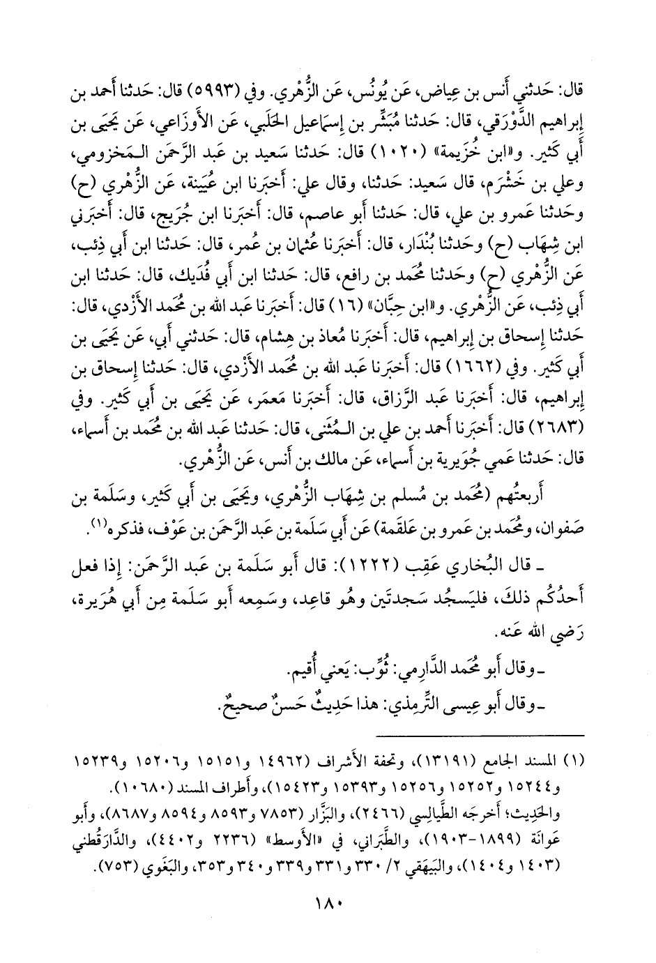 وفي (٥٩٩٣) قال: حدثنا أحمد بن إبراهيم الدورقي، قال: حدثنا مبشر بن إسماعيل الحلبي، عن الأوزاعي، عن يحيى بن أبي كثير. و «ابن خزيمة» (١٠٢٠) قال: حدثنا سعيد بن عبد الرَّحمَن المخزومي، وعلي بن خشرم، قال سعيد: حدثنا، وقال علي: أخبرنا ابن عُيينة، عن الزُّهْري (ح) وحدثنا عَمرو بن علي، قال: حدثنا أَبو عاصم، قال: أخبرنا ابن جُريج، قال: أخبرني ابن شهاب (ح) وحدثنا بُندَار، قال: أخبرنا عثمان بن عمر، قال: حدثنا ابن أبي ذِئب، عن الزُّهْري (ح) وحدثنا محمد بن رافع، قال: حدثنا ابن أبي فُديك، قال: حدثنا ابن أبي ذِئب، عن الزُّهْري. و «ابن حِبَّان» (١٦) قال: أخبرنا عبد الله بن محمد الأزدي، قال: حدثنا إسحاق بن إبراهيم، قال: أخبرنا معاذ بن هشام، قال: حدثني أبي، عن يحيى بن أبي كثير. وفي (١٦٦٢) قال: أخبرنا عبد الله بن محمد الأزدي، قال: حدثنا إسحاق بن إبراهيم، قال: أخبرنا عبد الرزاق، قال: أخبرنا مَعمَر، عن يحيى بن أبي كثير. وفي (٢٦٨٣) قال: أخبرنا أحمد بن علي بن المثنى، قال: حدثنا عبد الله بن محمد بن أسماء، قال: حدثنا عمي جويرية بن أسماء، عن مالك بن أنس، عن الزُّهْري.