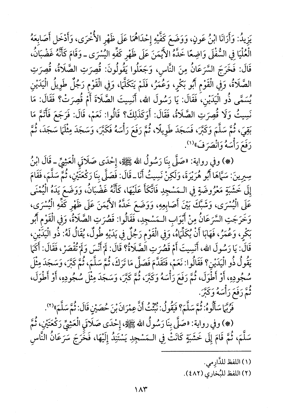 - وفي رواية: «صلى بنا رسول الله صَلى الله عَليه وسَلم إحدى صلاتي العشي ـ قال ابن سِيرين: سماها أَبو هريرة، ولكن نسيت أنا ـ قال: فصلى بنا ركعتين، ثم سلم، فقام إلى خشبة معروضة في المسجد فاتكأ عليها، كأنه غضبان، ووضع يده اليمنى على اليسرى، وشبك بين أصابعه، ووضع خده الأيمن على ظهر كفه اليسرى، وخرجت السرعان من أَبواب المسجد، فقالوا: قصرت الصلاة، وفي القوم أَبو بكر، وعمر، فهابا أن يكلماه، وفي القوم رجل في يديه طول، يقال له: ذو اليدين، قال: يا رسول الله، أنسيت أم قصرت الصلاة؟ قال: لم أَنس ولم تقصر، فقال: أكما يقول ذو اليدين؟ فقالوا: نعم، فتقدم فصلى ما ترك، ثم سلم، ثم كبر، وسجد مثل سجوده، أو أطول، ثم رفع رأسه وكبر، ثم كبر، وسجد مثل سجوده، أو أطول، ثم رفع رأسه وكبر.