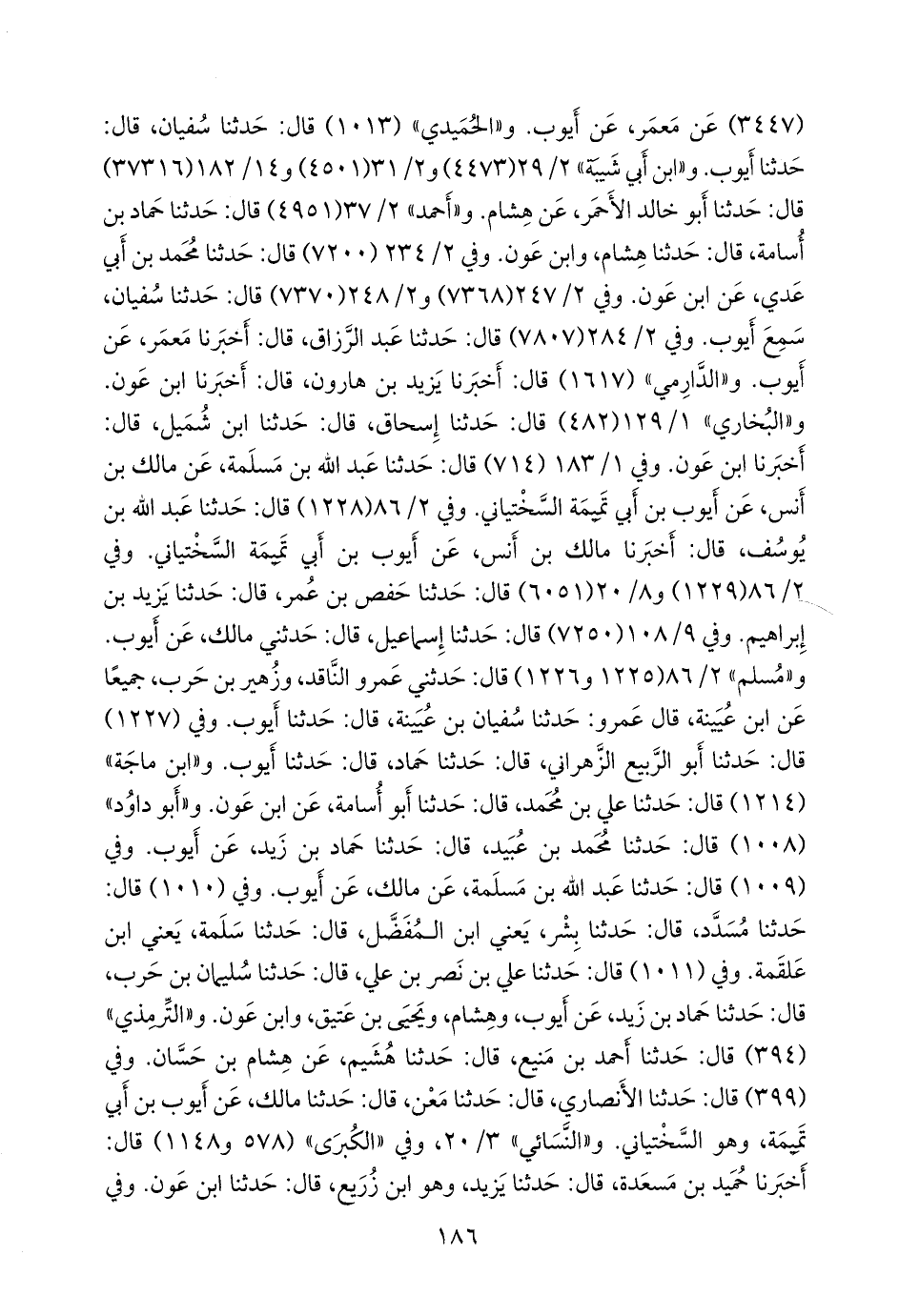 و «أحمد» ٢/ ٣٧ (٤٩٥١) قال: حدثنا حماد بن أسامة، قال: حدثنا هشام، وابن عَون. وفي ٢/ ٢٣٤ (٧٢٠٠) قال: حدثنا محمد بن أَبي عَدي، عن ابن عَون. وفي ٢/ ٢٤٧ (٧٣٦٨) و ٢/ ٢٤٨ (٧٣٧٠) قال: حدثنا سفيان، سمع أيوب. وفي ٢/ ٢٨٤ (٧٨٠٧) قال: حدثنا عبد الرزاق، قال: أخبرنا مَعمَر، عن أيوب. و «الدَّارِمي» (١٦١٧) قال: أخبرنا يزيد بن هارون، قال: أخبرنا ابن عَون. و «البخاري» ١/ ١٠٣ (٤٨٢) قال: حدثنا إسحاق، قال: حدثنا ابن شميل، قال: أخبرنا ابن عَون. وفي ١/ ١٤٤ (٧١٤) قال: حدثنا عبد الله بن مَسلَمة، عن مالك بن أنس، عن أيوب بن أبي تميمة السَّخْتِياني. وفي ٢/ ٦٨ (١٢٢٨) قال: حدثنا عبد الله بن يوسف، قال: أخبرنا مالك بن أنس، عن أيوب بن أبي تميمة السَّخْتِياني. وفي ٢/ ٦٨ (١٢٢٩) و ٨/ ١٦ (٦٠٥١) قال: حدثنا حفص بن عمر، قال: حدثنا يزيد بن إبراهيم. وفي ٩/ ٨٧ (٧٢٥٠) قال: حدثنا إسماعيل، قال: حدثني مالك، عن أيوب. و «مسلم» ٢/ ٨٦ (١٢٢٥ و ١٢٢٦) قال: حدثني عَمرو الناقد، وزهير بن حرب، جميعا عن ابن عُيينة، قال عَمرو: حدثنا سفيان بن عُيينة، قال: حدثنا أيوب. وفي (١٢٢٧) قال: حدثنا أَبو الربيع الزهراني، قال: حدثنا حماد، قال: حدثنا أيوب. و «ابن ماجة» (١٢١٤) قال: حدثنا علي بن محمد، قال: حدثنا أَبو أسامة، عن ابن عَون. و «أَبو داود» (١٠٠٨) قال: حدثنا محمد بن عبيد، قال: حدثنا حماد بن زيد، عن أيوب. وفي (١٠٠٩) قال: حدثنا عبد الله بن مَسلَمة، عن مالك، عن أيوب. وفي (١٠١٠) قال: حدثنا مُسدد، قال: حدثنا بشر، يعني ابن المُفَضَّل، قال: حدثنا سلمة، يعني ابن علقمة. وفي (١٠١١) قال: حدثنا علي بن نصر بن علي، قال: حدثنا سليمان بن حرب، قال: حدثنا حماد بن زيد، عن أيوب، وهشام، ويحيى بن عتيق، وابن عَون. و «التِّرمِذي» (٣٩٤) قال: حدثنا أحمد بن مَنيع، قال: حدثنا هُشيم، عن هشام بن حسان. وفي (٣٩٩) قال: حدثنا الأَنصاري، قال: حدثنا مَعْن، قال: حدثنا مالك، عن أيوب بن أبي تميمة، وهو السَّخْتِياني. و «النَّسَائي» ٣/ ٢٠، وفي «الكبرى» (٥٧٨ و ١١٤٨) قال: أخبرنا حميد بن مَسعَدة، قال: حدثنا يزيد، وهو ابن زُريع، قال: حدثنا ابن عَون. وفي