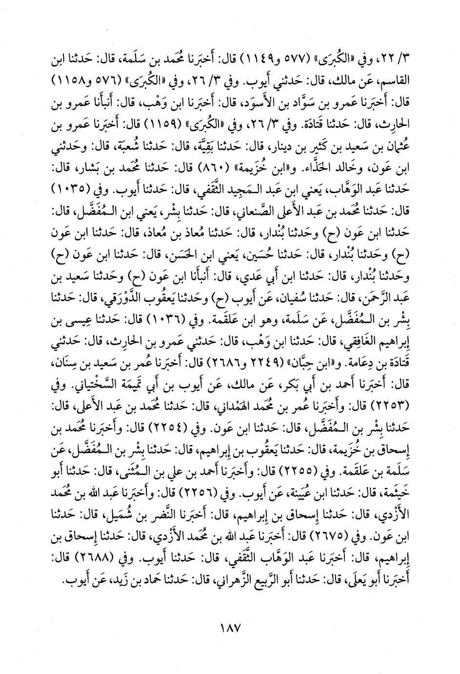 وفي ٣/ ٢٦، وفي «الكبرى» (٥٧٦ و ١١٥٨) قال: أخبرنا عَمرو بن سواد بن الأسود، قال: أخبرنا ابن وهب، قال: أنبأنا عَمرو بن الحارث، قال: حدثنا قتادة. وفي ٣/ ٢٦، وفي «الكبرى» (١١٥٩) قال: أخبرنا عَمرو بن عثمان بن سعيد بن كثير بن دينار، قال: حدثنا بقية، قال: حدثنا شعبة، قال: وحدثني ابن عَون، وخالد الحَذَّاء. و «ابن خزيمة» (٨٦٠) قال: حدثنا محمد بن بشار، قال: حدثنا عبد الوَهَّاب، يعني ابن عبد المجيد الثقفي، قال: حدثنا أيوب. وفي (١٠٣٥) قال: حدثنا محمد بن عبد الأعلى الصَّنْعاني، قال: حدثنا بشر، يعني ابن المُفَضَّل، قال: حدثنا ابن عَون (ح) وحدثنا بُندَار، قال: حدثنا معاذ بن معاذ، قال: حدثنا ابن عَون (ح) وحدثنا بُندَار، قال: حدثنا حسين، يعني ابن الحسن، قال: حدثنا ابن عَون (ح) وحدثنا بُندَار، قال: حدثنا ابن أَبي عَدي، قال: أنبأنا ابن عَون (ح) وحدثنا سعيد بن عبد الرَّحمَن، قال: حدثنا سفيان، عن أيوب (ح) وحدثنا يعقوب الدورقي، قال: حدثنا بشر بن المُفَضَّل، عن سلمة، وهو ابن علقمة. وفي (١٠٣٦) قال: حدثنا عيسى بن إبراهيم الغافقي، قال: حدثنا ابن وهب، قال: حدثني عَمرو بن الحارث، قال: حدثني قتادة بن دعامة. و «ابن حِبَّان» (٢٢٤٩ و ٢٦٨٦) قال: أخبرنا عمر بن سعيد بن سنان، قال: أخبرنا أحمد بن أَبي بكر، عن مالك، عن أيوب بن أبي تميمة السَّخْتِياني. وفي (٢٢٥٣) قال: وأخبرنا عمر بن محمد الهمداني، قال: حدثنا محمد بن عبد الأعلى، قال: حدثنا بشر بن المُفَضَّل، قال: حدثنا ابن عَون. وفي (٢٢٥٤) قال: وأخبرنا محمد بن إسحاق بن خزيمة، قال: حدثنا يعقوب بن إبراهيم، قال: حدثنا بشر بن المُفَضَّل، عن سلمة بن علقمة. وفي (٢٢٥٥) قال: وأخبرنا أحمد بن علي بن المثنى، قال: حدثنا أَبو خيثمة، قال: حدثنا ابن عُيينة، عن أيوب. وفي (٢٢٥٦) قال: وأخبرنا عبد الله بن محمد الأزدي، قال: حدثنا إسحاق بن إبراهيم، قال: أخبرنا النضر بن شميل، قال: حدثنا ابن عَون. وفي (٢٦٧٥) قال: أخبرنا عبد الله بن محمد الأزدي، قال: حدثنا إسحاق بن إبراهيم، قال: أخبرنا عبد الوَهَّاب الثقفي، قال: حدثنا أيوب. وفي (٢٦٨٨) قال: أخبرنا أَبو يَعلى، قال: حدثنا أَبو الربيع الزهراني، قال: حدثنا حماد بن زيد، عن أيوب.