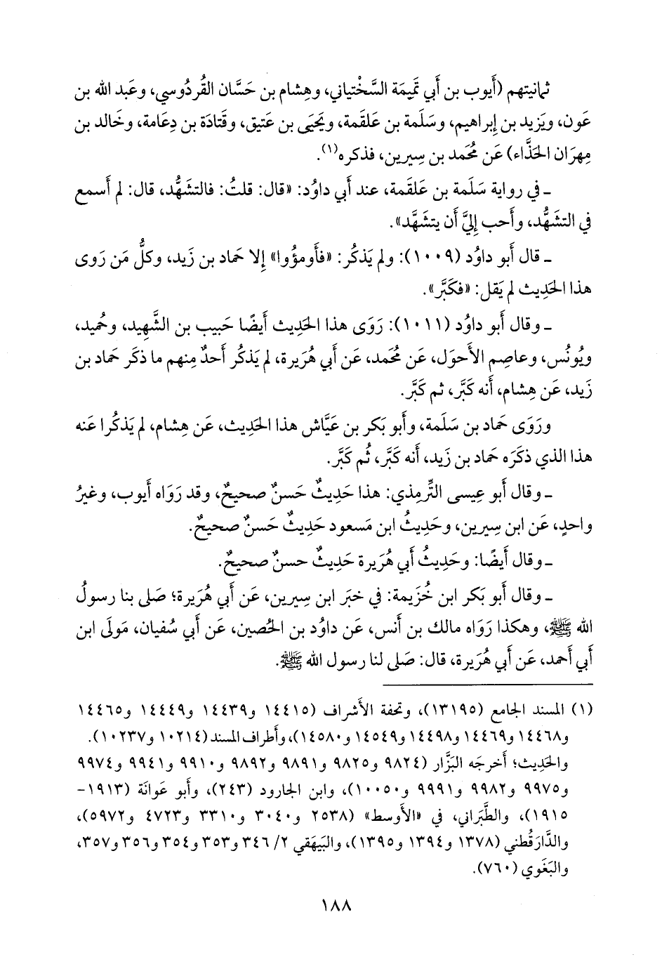 - وقال أَبو داود (١٠١١): روى هذا الحديث أيضا حبيب بن الشهيد، وحميد، ويونس، وعاصم الأحول، عن محمد، عن أبي هريرة، لم يذكر أحد منهم ما ذكر حماد بن زيد، عن هشام، أنه كبر، ثم كبر.