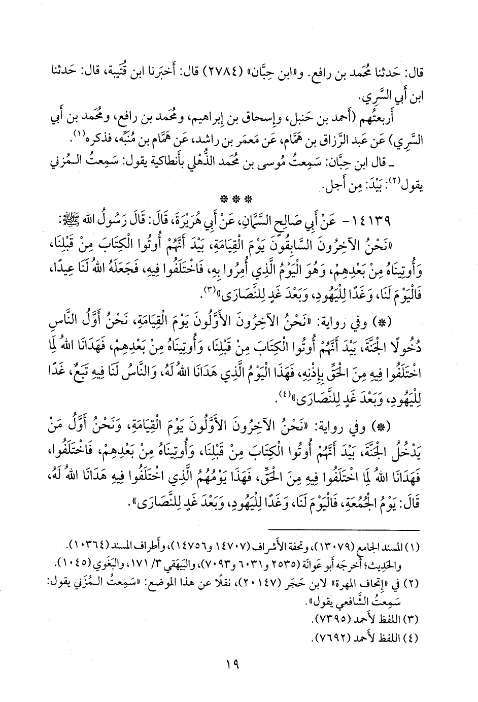 - وفي رواية: «نحن الآخرون الأولون يوم القيامة، ونحن أول من يدخل الجنة، بيد أنهم أوتوا الكتاب من قبلنا، وأوتيناه من بعدهم، فاختلفوا، فهدانا الله لما اختلفوا فيه من الحق، فهذا يومهم الذي اختلفوا فيه هدانا الله له، قال: يوم الجمعة، فاليوم لنا، وغدا لليهود، وبعد غد للنصارى».