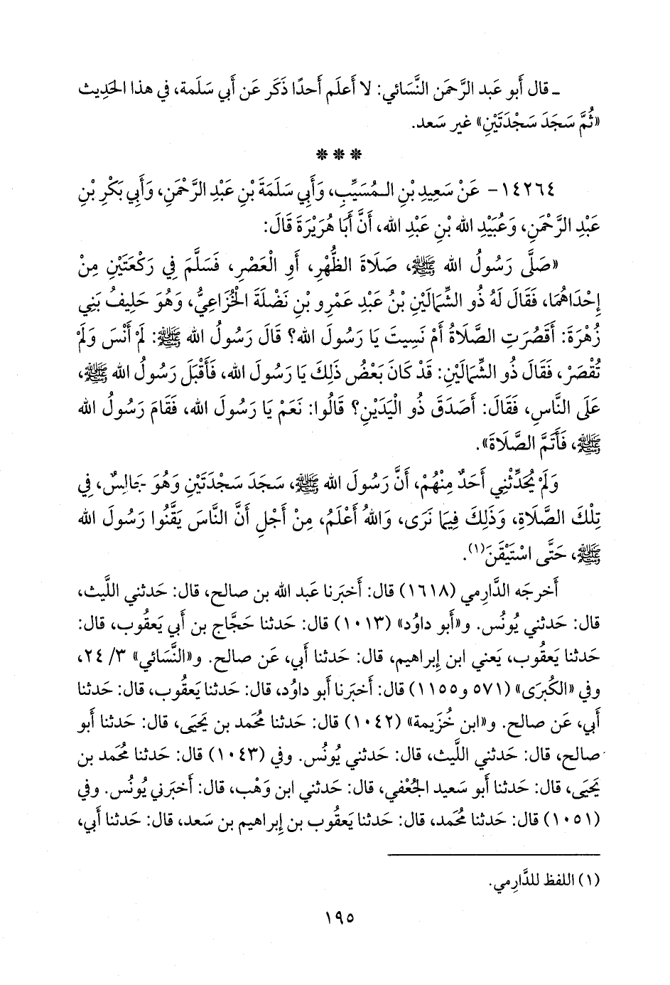 «صلى رسول الله صَلى الله عَليه وسَلم صلاة الظهر، أو العصر، فسلم في ركعتين من إحداهما، فقال له ذو الشمالين بن عبد عَمرو بن نضلة الخُزاعي، وهو حليف بني زُهرَة: أقصرت الصلاة أم نسيت يا رسول الله؟ قال رسول الله صَلى الله عَليه وسَلم: لم أَنس ولم تقصر، فقال ذو الشمالين: قد كان بعض ذلك يا رسول الله، فأقبل رسول الله صَلى الله عَليه وسَلم على الناس، فقال: أصدق ذو اليدين؟ قالوا: نعم يا رسول الله، فقام رسول الله صَلى الله عَليه وسَلم فأتم الصلاة».