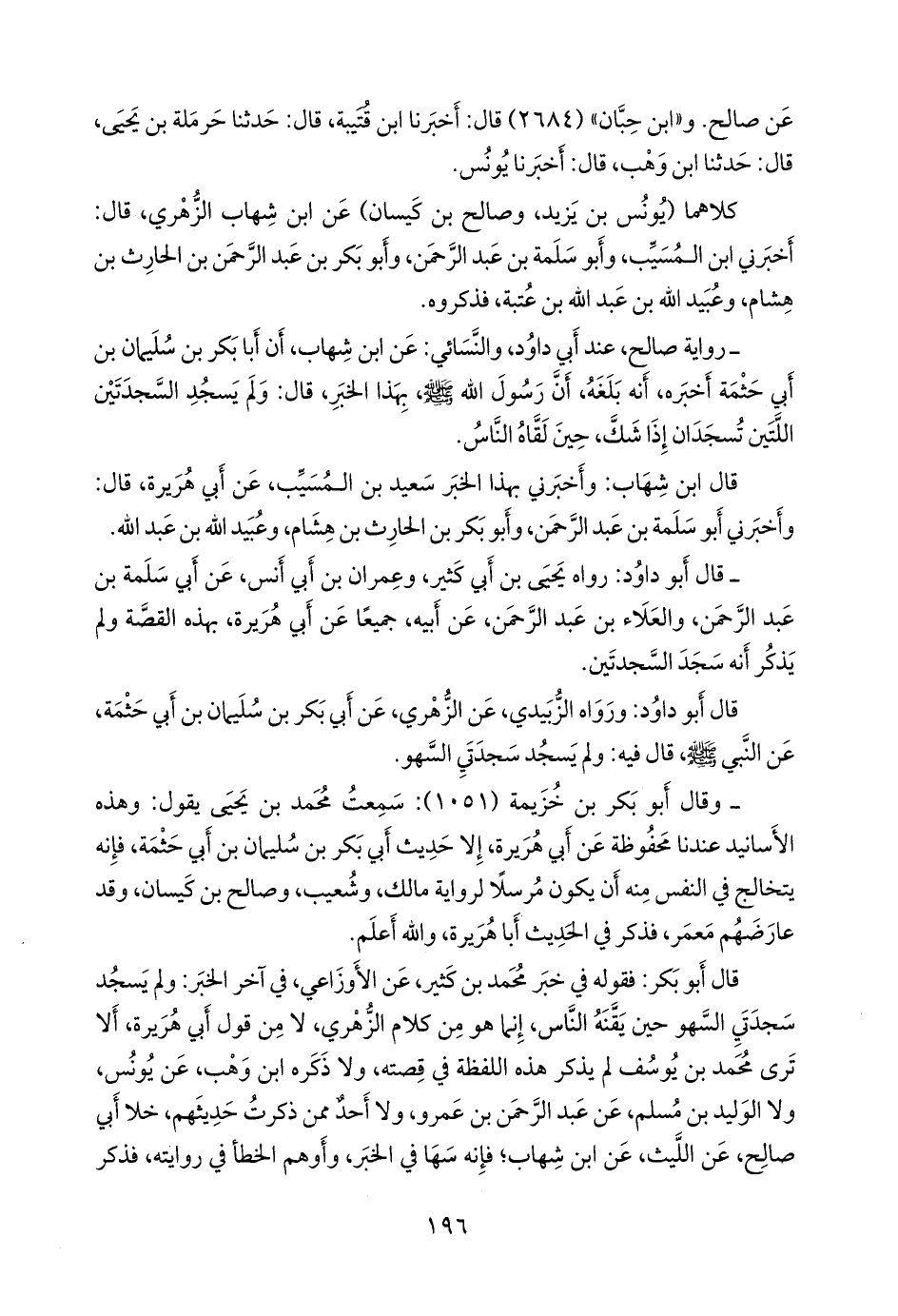 آخر الكلام الذي هو من قول الزُّهْري مجردا، عن أبي هريرة، أن رسول الله صَلى الله عَليه وسَلم لم يسجد يوم ذي اليدين، ولم يحفظ القصة بتمامها، والليث في خبره عن يونس قد ذكر القصة بتمامها، وأعلم أن الزُّهْري إنما، قال: لم يسجد النبي صَلى الله عَليه وسَلم يومئذ، أنه لم يحدثه أحد منهم، أن النبي صَلى الله عَليه وسَلم سجد يومئذ، لا أنهم حدثوه، عن أبي هريرة، أن النبي صَلى الله عَليه وسَلم لم يسجد يومئذ، وقد تواترت الأخبار، عن أبي هريرة من الطرق التي لا يدفعها عالم بالأخبار، أن النبي صَلى الله عَليه وسَلم سجد سجدتي السهو يوم ذي اليدين.