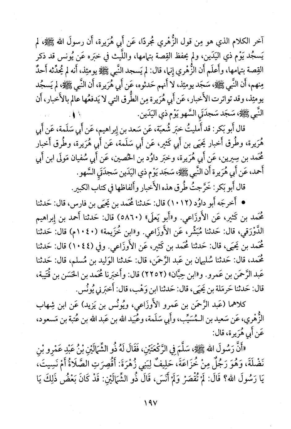 قال أَبو بكر: قد أمليت خبر شعبة، عن سعد بن إبراهيم، عن أبي سلمة، عن أبي هريرة، وطرق أخبار يحيى بن أبي كثير، عن أبي سلمة، عن أبي هريرة، وطرق أخبار محمد بن سِيرين، عن أبي هريرة، وخبر داود بن الحُصين، عن أبي سفيان مولى ابن أبي أحمد، عن أبي هريرة أن النبي صَلى الله عَليه وسَلم سجد يوم ذي اليدين سجدتي السهو.