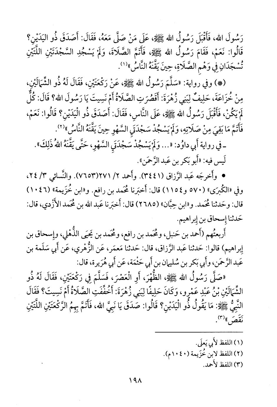 - وفي رواية: «سلم رسول الله صَلى الله عَليه وسَلم عن ركعتين، فقال له ذو الشمالين، من خزاعة، حليف لبني زُهرَة: أقصرت الصلاة أم نسيت يا رسول الله؟ قال: كل لم يكن، فأقبل رسول الله صَلى الله عَليه وسَلم على الناس، فقال: أصدق ذو اليدين؟ قالوا: نعم، فأتم ما بقي من صلاته، ولم يسجد سجدتي السهو حين يقنه الناس» (¬١).