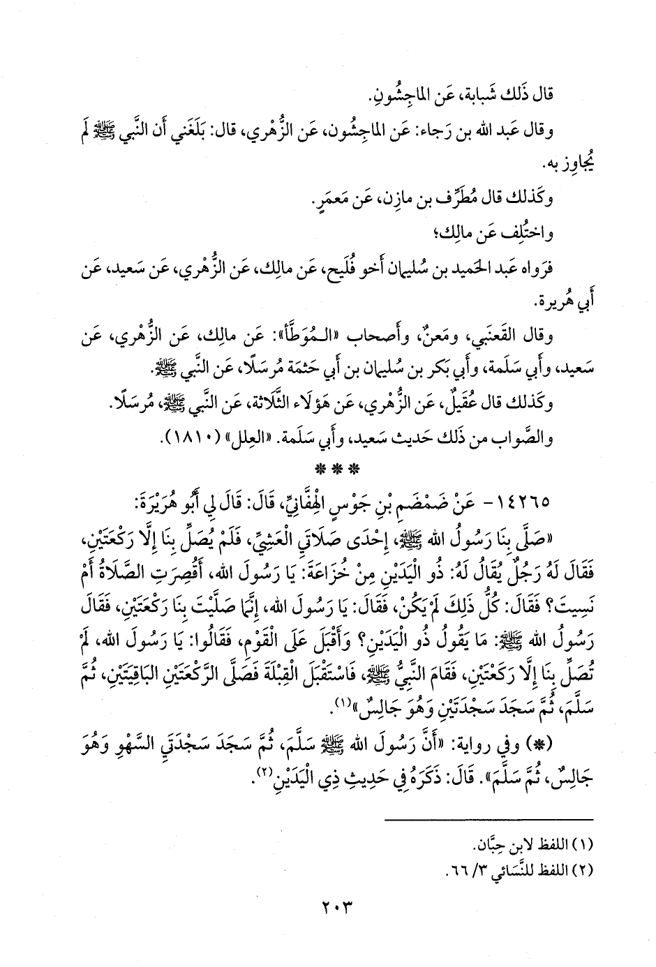 «صلى بنا رسول الله صَلى الله عَليه وسَلم إحدى صلاتي العشي، فلم يصل بنا إلا ركعتين، فقال له رجل يقال له: ذو اليدين من خزاعة: يا رسول الله، أقصرت الصلاة أم نسيت؟ فقال: كل ذلك لم يكن، فقال: يا رسول الله، إنما صليت بنا ركعتين، فقال رسول الله صَلى الله عَليه وسَلم: ما يقول ذو اليدين؟ وأقبل على القوم، فقالوا: يا رسول الله، لم تصل بنا إلا ركعتين، فقام النبي صَلى الله عَليه وسَلم فاستقبل القبلة فصلى الركعتين الباقيتين، ثم سلم، ثم سجد سجدتين وهو جالس» (¬١).