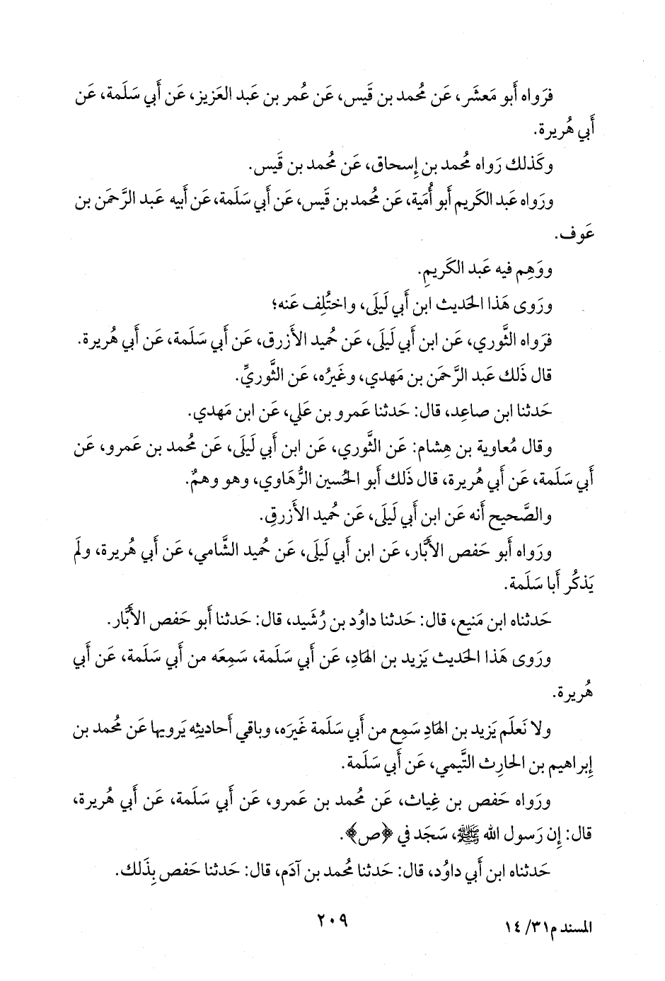 وخالفه إسماعيل بن جعفر، وغيره، عن محمد بن عَمرو، عن أبي سلمة، عن أبي هريرة، أن النبي صَلى الله عَليه وسَلم سجد في {إذا السماء انشقت}، وهو الصواب. «العلل» (١٣٧٦).