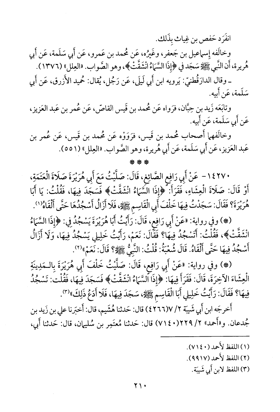 ١٤٢٧٠ - عن أبي رافع الصائغ، قال: صليت مع أبي هريرة صلاة العتمة، أو قال: صلاة العشاء، فقرأ: {إذا السماء انشقت} فسجد فيها، فقلت: يا أبا هريرة؟ فقال: سجدت فيها خلف أبي القاسم صَلى الله عَليه وسَلم فلا أزال أسجدها حتى ألقاه (¬١).