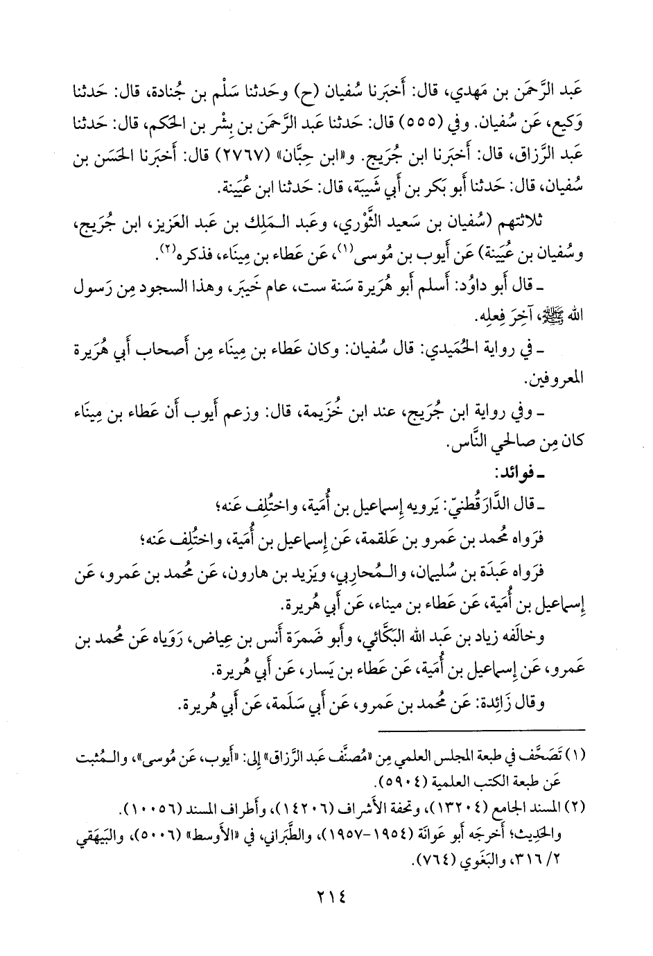 - في رواية الحميدي: قال سفيان: وكان عطاء بن ميناء من أصحاب أبي هريرة المعروفين.