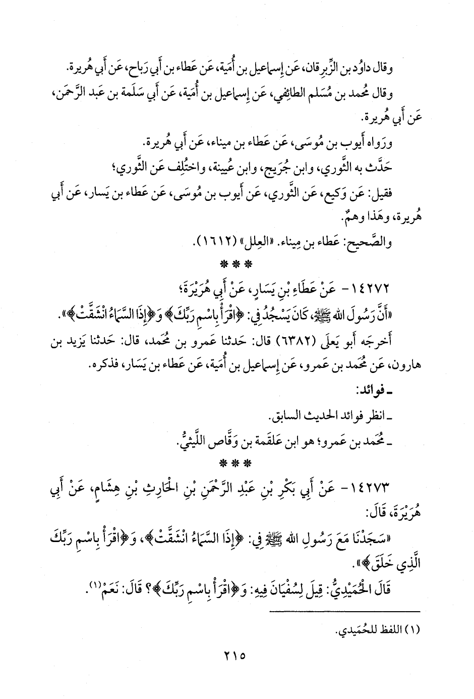 خمستهم (عبد الله بن الزبير الحميدي، وأَبو بكر بن أبي شيبة، وأحمد بن حنبل، وقتيبة بن سعيد، ومحمد بن منصور) عن سفيان بن عُيينة، عن يحيى بن سعيد، عن أَبي بكر بن محمد بن عَمرو بن حزم الأَنصاري، عن عمر بن عبد العزيز، عن أَبي بكر بن عبد الرَّحمَن بن الحارث بن هشام المخزومي، فذكره (¬٣).