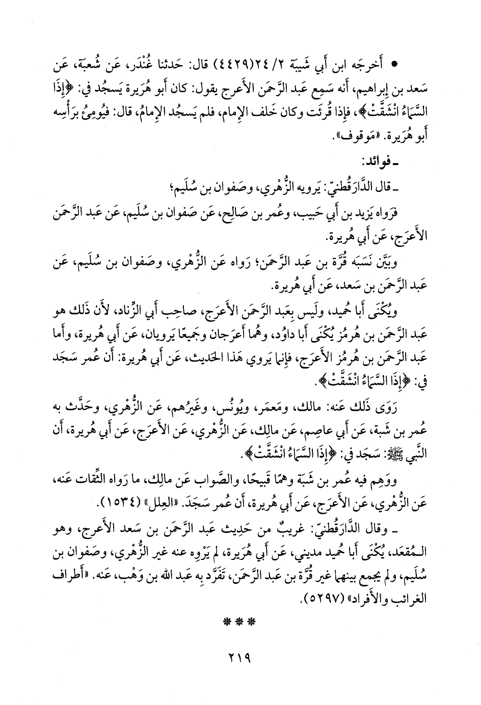 - وقال الدارقُطني: غريب من حديث عبد الرَّحمَن بن سعد الأعرج، وهو المقعد، يكنى أبا حميد مديني، عن أبي هريرة، لم يروه عنه غير الزُّهْري، وصفوان بن سليم، ولم يجمع بينهما غير قرة بن عبد الرَّحمَن، تفرد به عبد الله بن وهب، عنه. «أطراف الغرائب والأفراد» (٥٢٩٧).